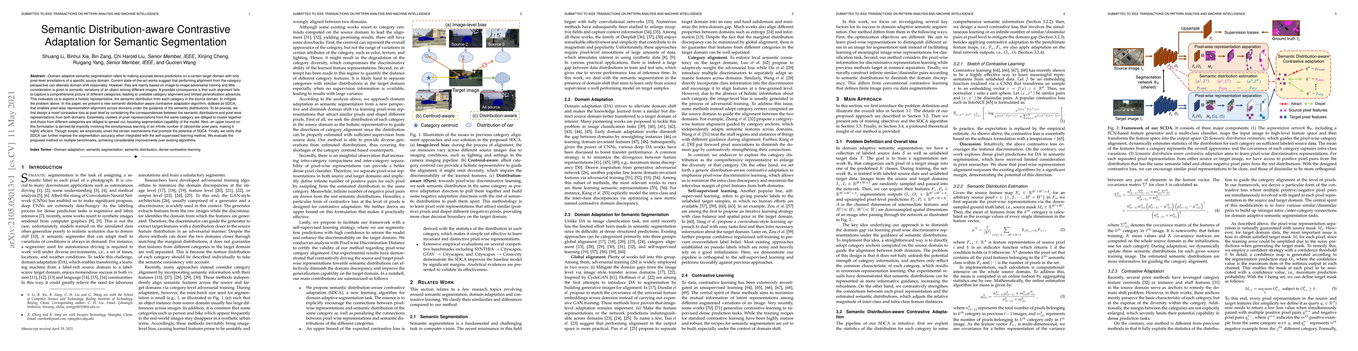 This paper proposes a semantic distribution-aware contrastive adaptation algorithm to improve domain adaptive semantic segmentation by aligning pixel-wise representations guided by semantic distributions. The method achieves better segmentation accuracy by leveraging self-supervised learning and is shown to outperform existing algorithms on multiple benchmarks.
