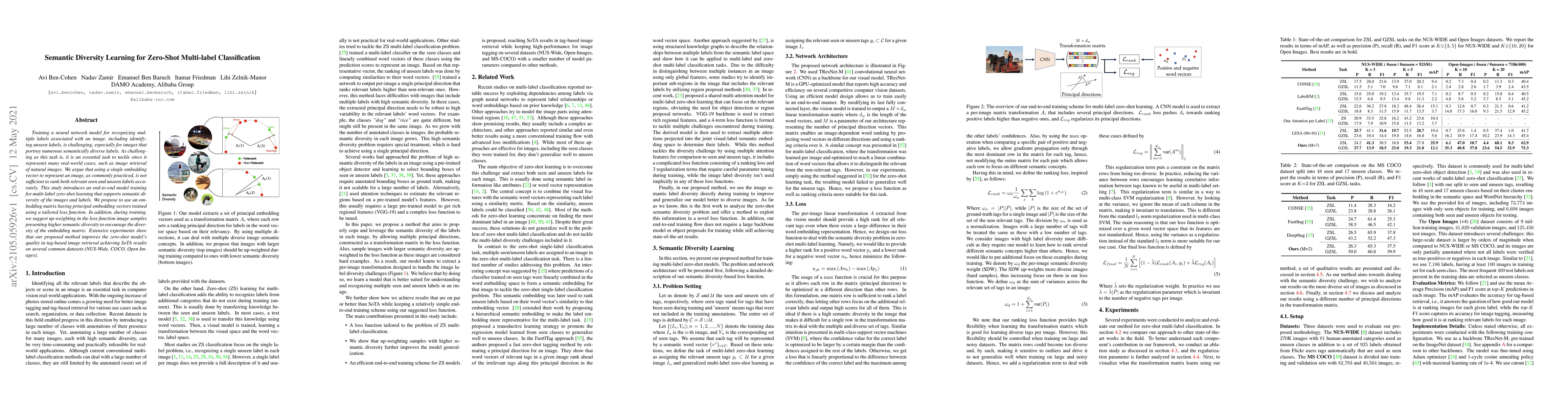 This paper proposes a novel end-to-end model for zero-shot multi-label classification that leverages an embedding matrix to represent semantic diversity in images and labels. The method achieves state-of-the-art results in tag-based image retrieval by up-weighting diverse samples during training.