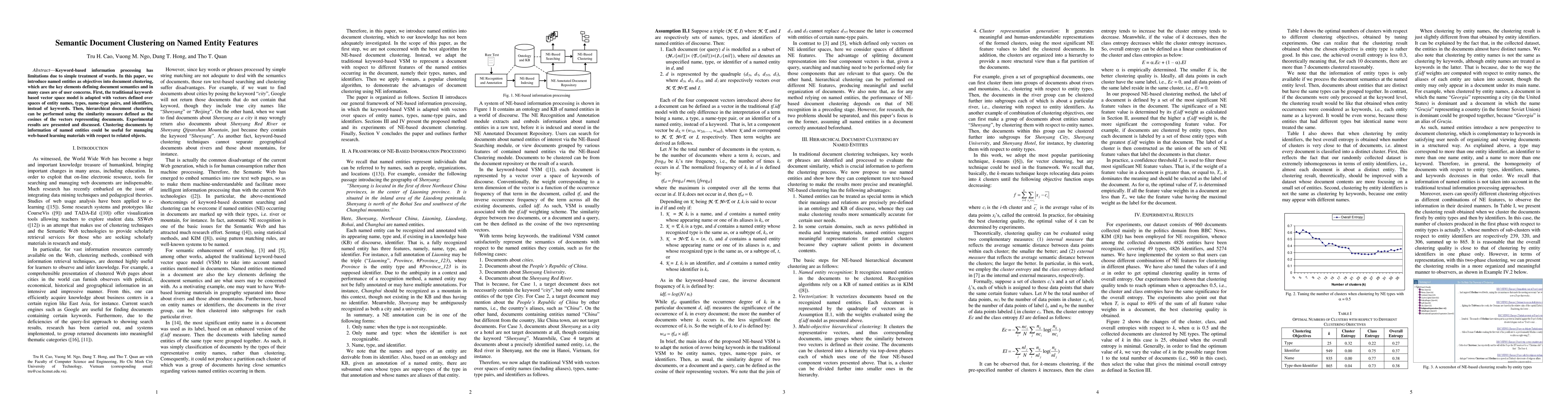 This paper proposes using named entities to enhance document clustering, moving beyond simple keyword processing. It adapts the vector space model to incorporate entity names, types, and pairs, then applies hierarchical clustering using cosine similarity. Results suggest this method can effectively organize web-based learning materials by related entities.