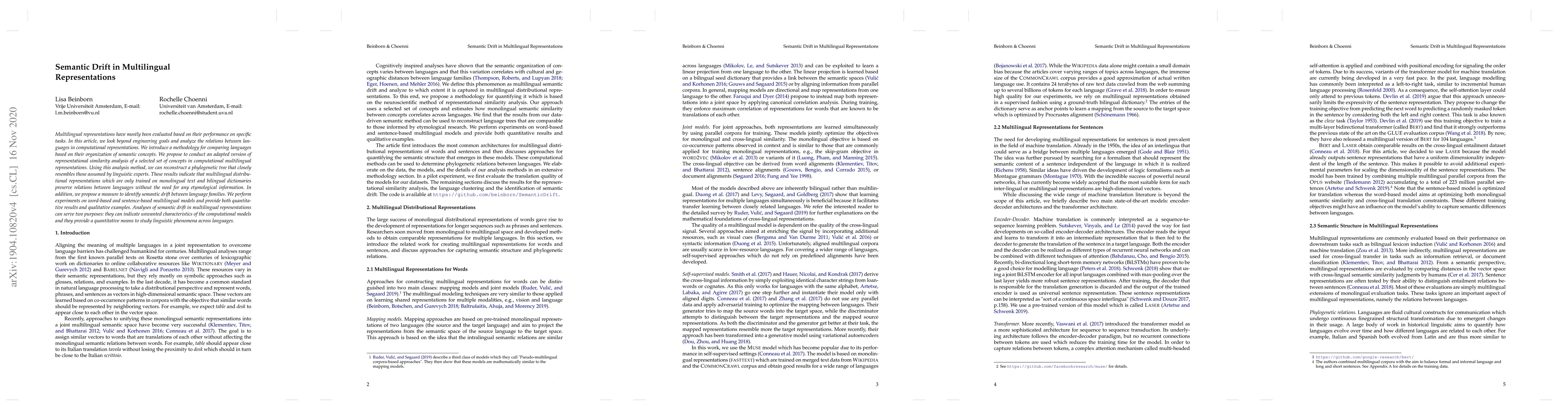 This research introduces a method to compare languages in multilingual computational representations, revealing semantic relationships akin to linguist expert trees, without etymological data. It also proposes a measure for semantic drift across languages, applicable to word and sentence models, aiding in model evaluation and linguistic study.