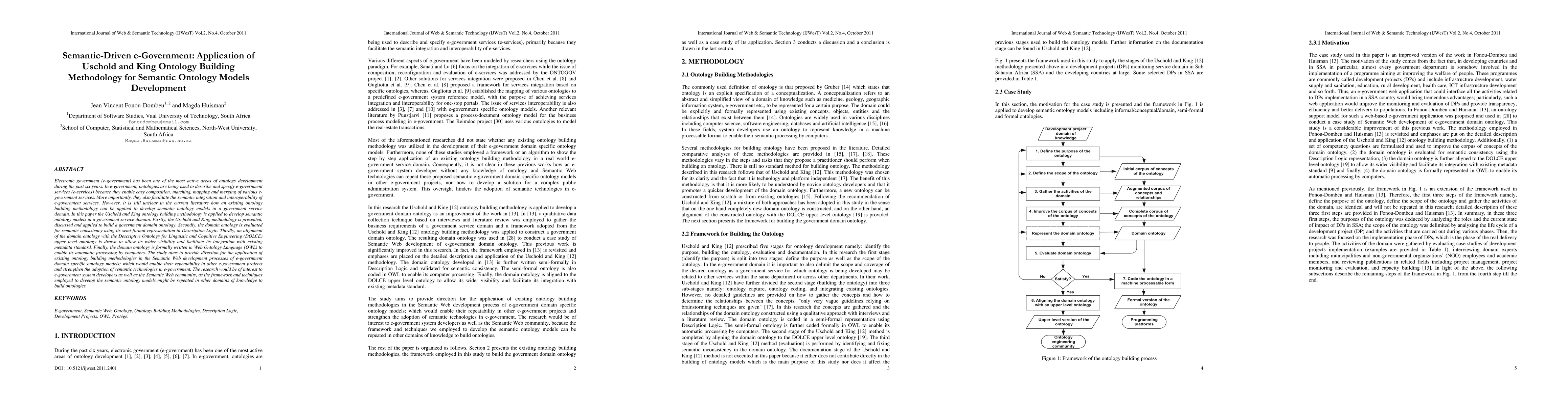 This paper applies the Uschold and King methodology to develop a government service domain ontology, evaluating its consistency and aligning it with DOLCE for broader integration. The aim is to demonstrate how existing ontology building methodologies can be utilized for e-government semantic ontology models, enhancing interoperability and repeatability in government projects.