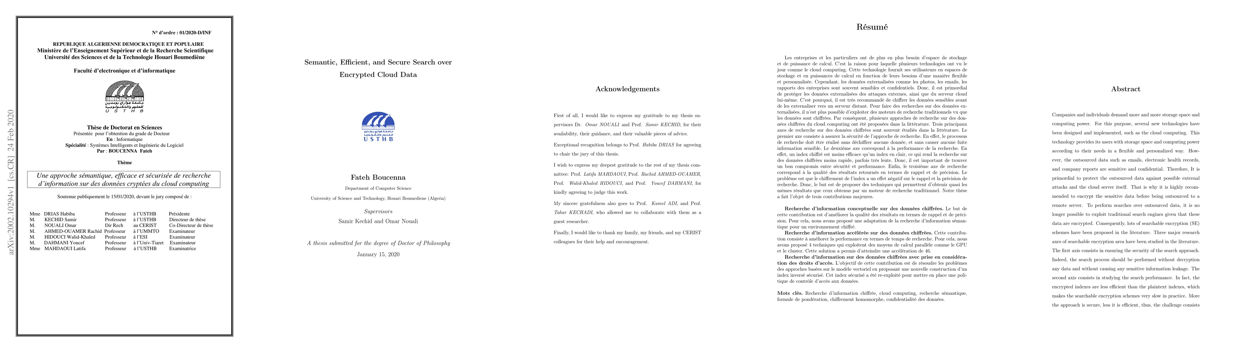Companies and individuals demand more and more storage space and computing power. For this purpose, several new technologies have been designed and implemented, such as the cloud computing. This technology provides its users with storage space and computing power according to their needs in a flexible and personalized way. However, the outsourced data such as emails, electronic health records, and company reports are sensitive and confidential. Therefore, It is primordial to protect the outsourced data against possible external attacks and the cloud server itself. That is why it is highly recommended to encrypt the sensitive data before being outsourced to a remote server. To perform searches over outsourced data, it is no longer possible to exploit traditional search engines given that these data are encrypted. Consequently, lots of searchable encryption (SE) schemes have been proposed in the literature. Three major research axes of searchable encryption area have been studied in the literature. The first axis consists in ensuring the security of the search approach. Indeed, the search process should be performed without decryption any data and without causing any sensitive information leakage. The second axis consists in studying the search performance. In fact, the encrypted indexes are less efficient than the plaintext indexes, which makes the searchable encryption schemes very slow in practice. More the approach is secure, less it is efficient, thus, the challenge consists in finding the best compromise between security and performance. Finally, the third research axis consists in the quality of the returned results in terms of relevance and recall. The problem is that the encryption of the index causes the degradation of the recall and the precision. Therefore, the goal is to propose a technique that is able to obtain almost the same result obtained in the traditional search.