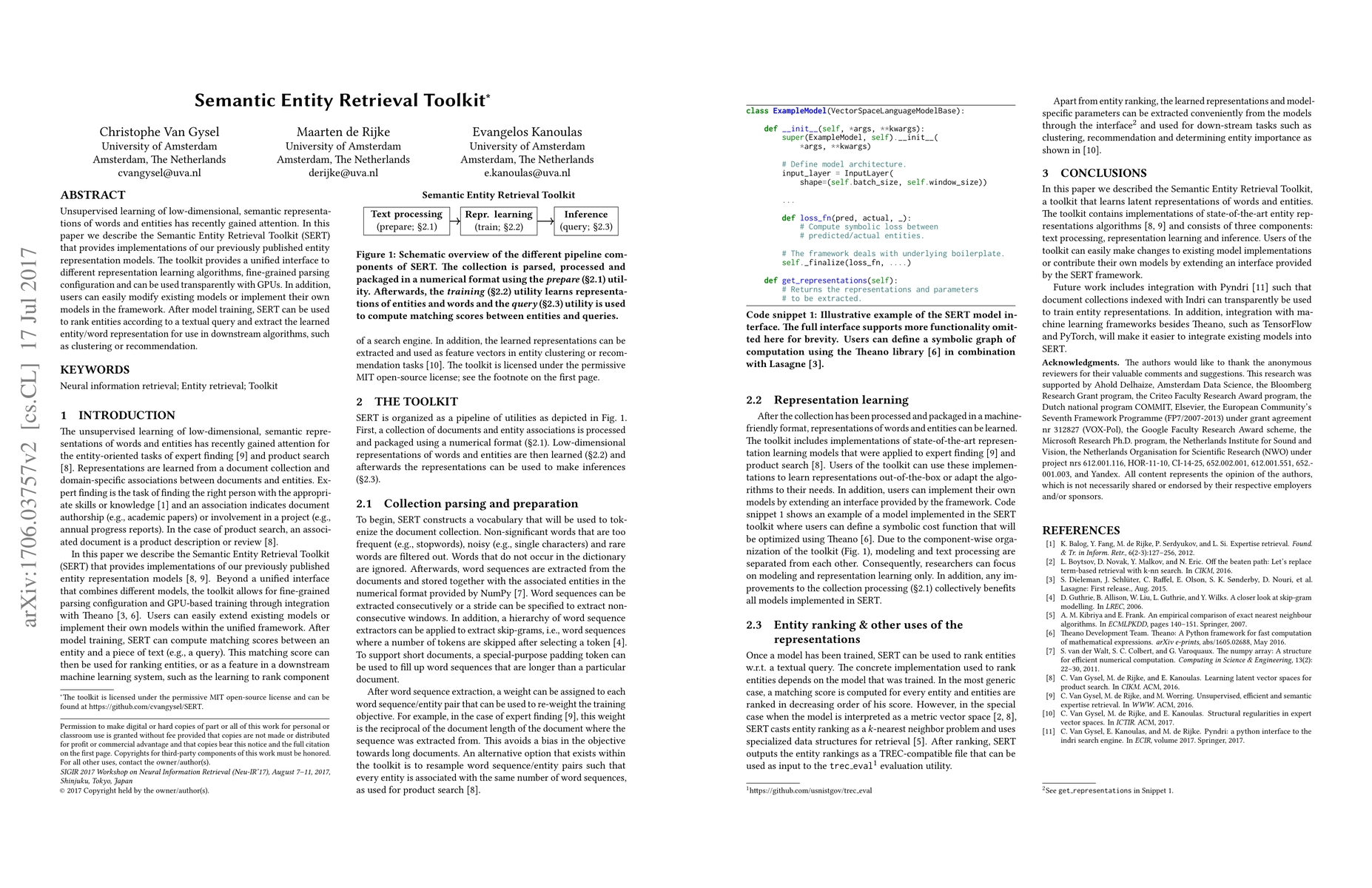 The Semantic Entity Retrieval Toolkit (SERT) offers implementations of unsupervised learning models for semantic representations of words and entities, providing a unified interface for various algorithms and GPU support. It facilitates entity ranking based on textual queries and extracts representations for downstream applications.