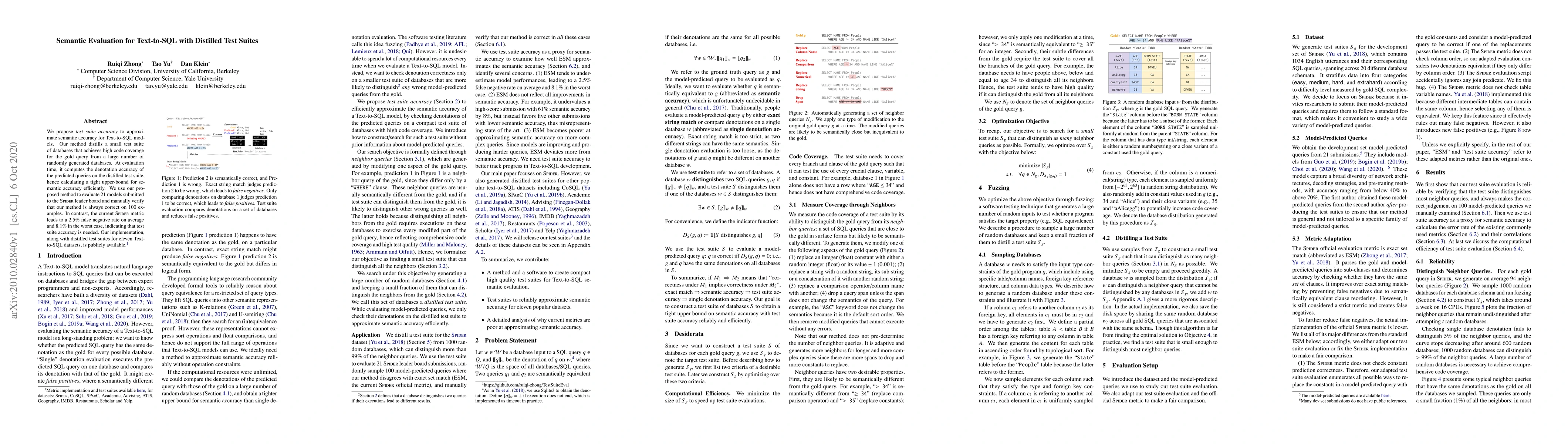 This paper introduces a new method for evaluating Text-to-SQL models using distilled test suites to achieve high code coverage, providing a tighter upper-bound for semantic accuracy compared to existing metrics. The proposed method is shown to be accurate on 100 examples and outperforms the current Spider leaderboard metric, which has a significant false negative rate.