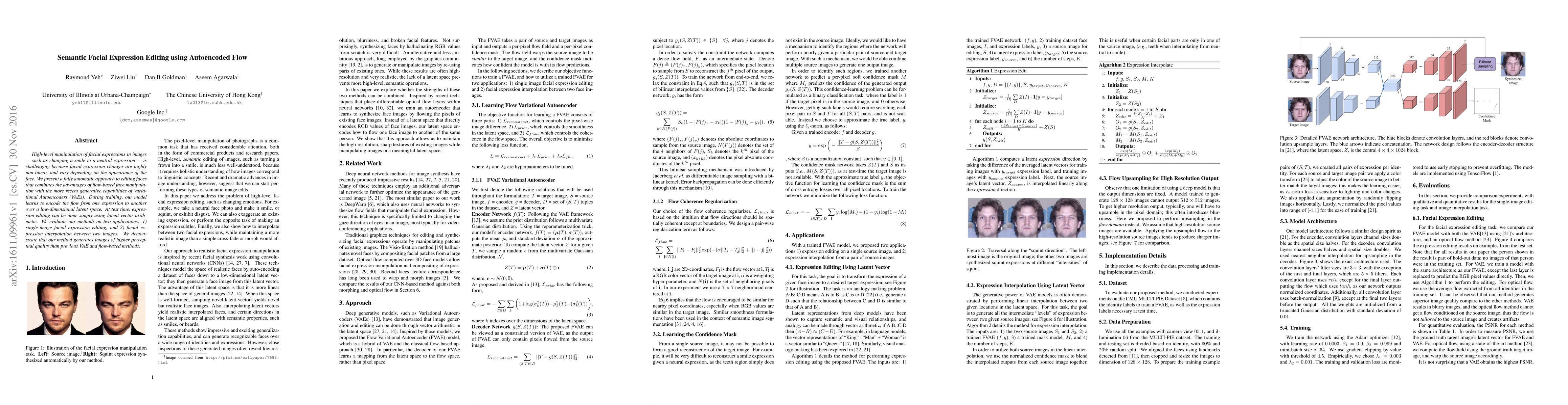 This paper proposes a method for automatic semantic facial expression editing by combining flow-based manipulation with Variational Autoencoders, enabling high-quality, non-linear expression changes through latent vector arithmetic. The approach is evaluated for single-image editing and expression interpolation, outperforming previous methods in perceptual quality.