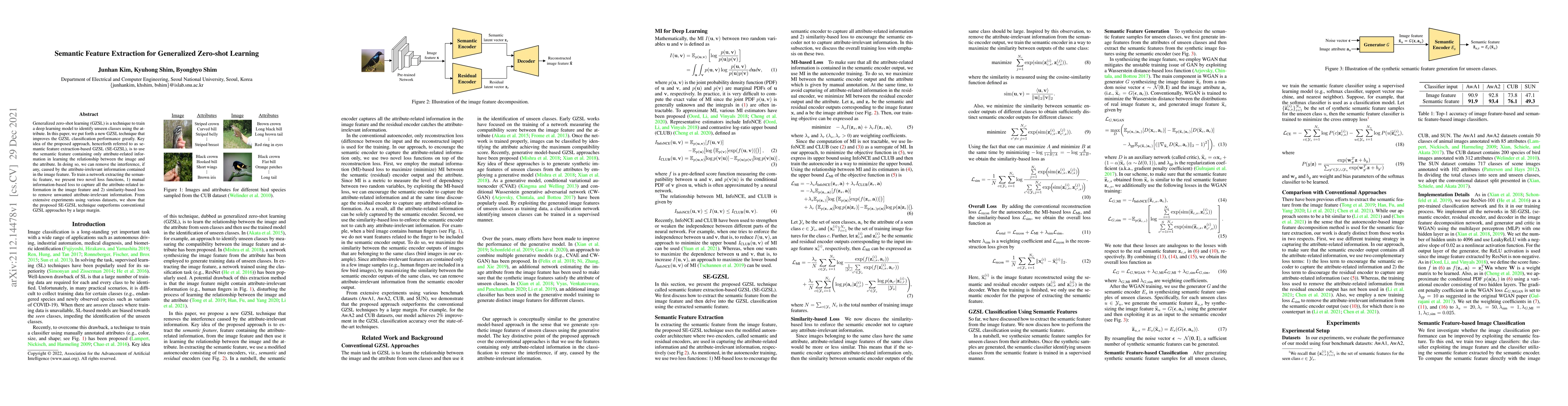 This paper introduces a new technique called semantic feature extraction-based GZSL (SE-GZSL) to enhance generalized zero-shot learning performance by focusing on attribute-related information. It employs two novel loss functions to improve the network's ability to extract relevant features, resulting in superior classification performance over conventional methods.