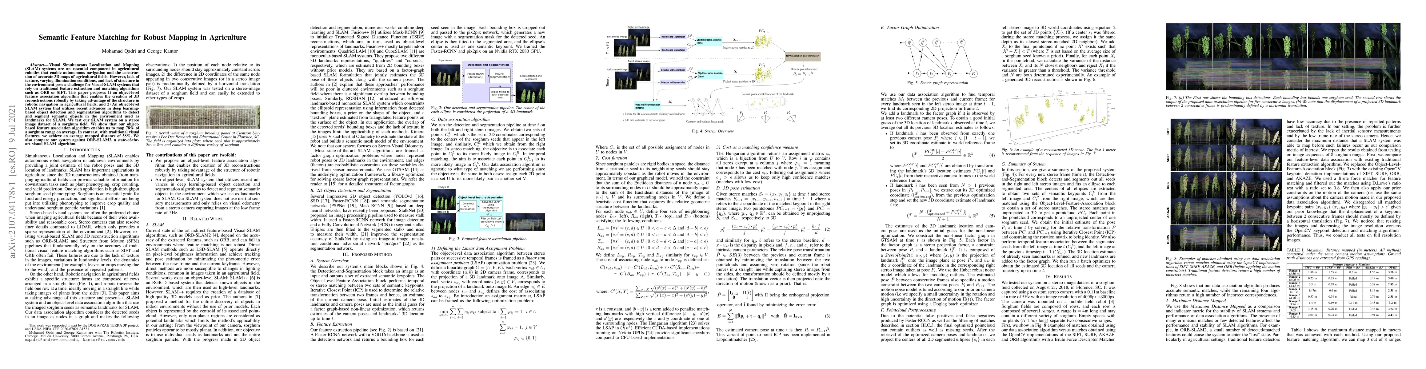 Visual Simultaneous Localization and Mapping (SLAM) systems are an essential component in agricultural robotics that enable autonomous navigation and the construction of accurate 3D maps of agricultural fields. However, lack of texture, varying illumination conditions, and lack of structure in the environment pose a challenge for Visual-SLAM systems that rely on traditional feature extraction and matching algorithms such as ORB or SIFT. This paper proposes 1) an object-level feature association algorithm that enables the creation of 3D reconstructions robustly by taking advantage of the structure in robotic navigation in agricultural fields, and 2) An object-level SLAM system that utilizes recent advances in deep learning-based object detection and segmentation algorithms to detect and segment semantic objects in the environment used as landmarks for SLAM. We test our SLAM system on a stereo image dataset of a sorghum field. We show that our object-based feature association algorithm enables us to map 78% of a sorghum range on average. In contrast, with traditional visual features, we achieve an average mapped distance of 38%. We also compare our system against ORB-SLAM2, a state-of-the-art visual SLAM algorithm.