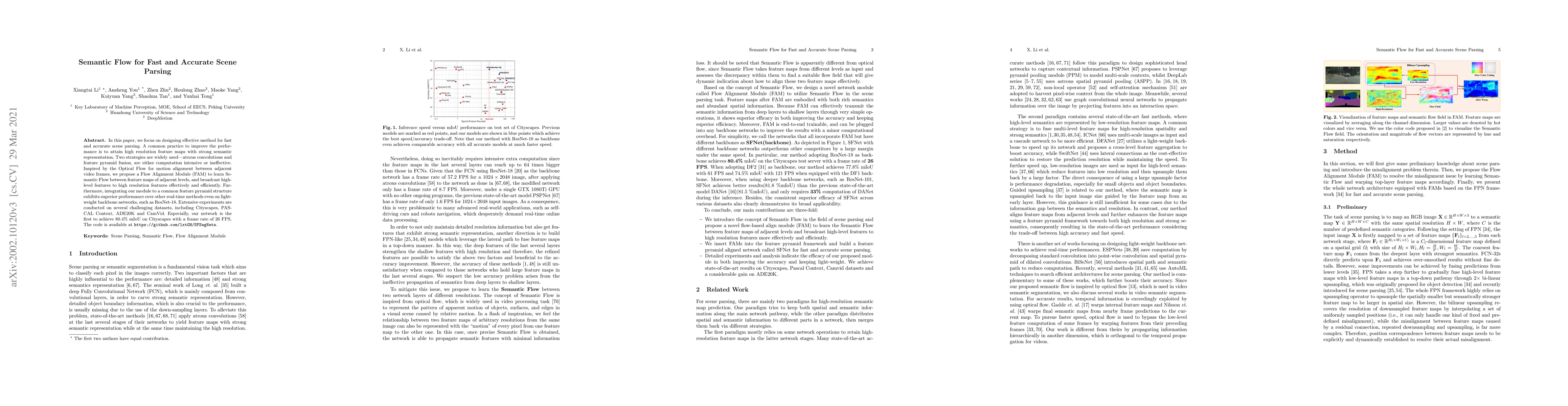 A new method called Flow Alignment Module (FAM) is proposed to improve scene parsing by learning semantic flow between adjacent feature maps, achieving high accuracy and fast processing times.