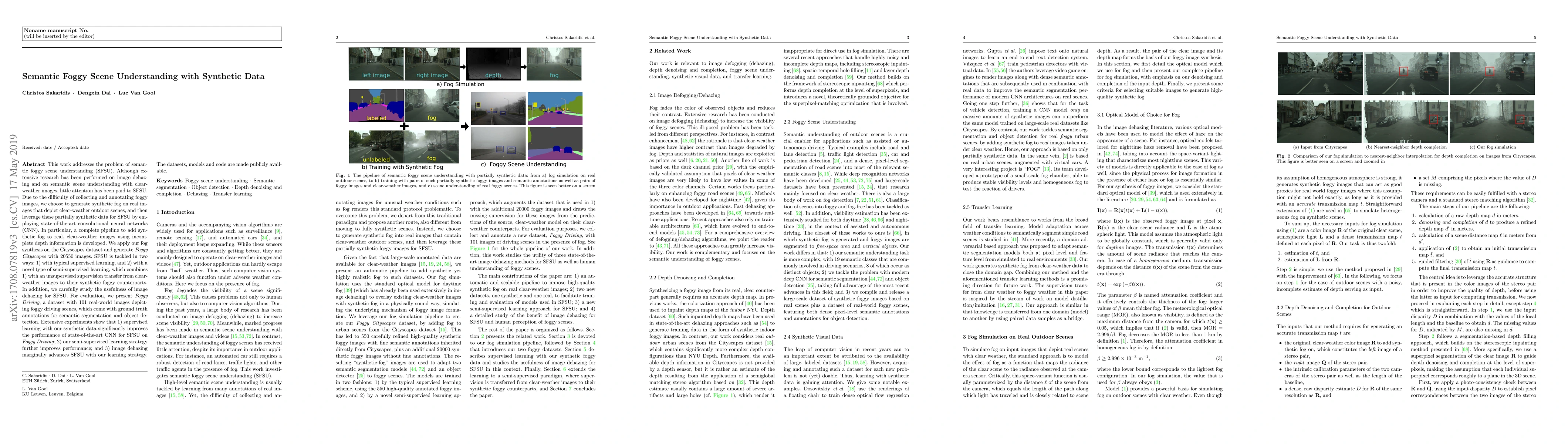 This paper develops a method for semantic foggy scene understanding (SFSU) using synthetic fog generated on clear-weather images, employing CNNs and semi-supervised learning. It introduces Foggy Cityscapes and Foggy Driving datasets, demonstrating improved SFSU performance with synthetic data and semi-supervised learning, while also evaluating the marginal benefits of image dehazing.