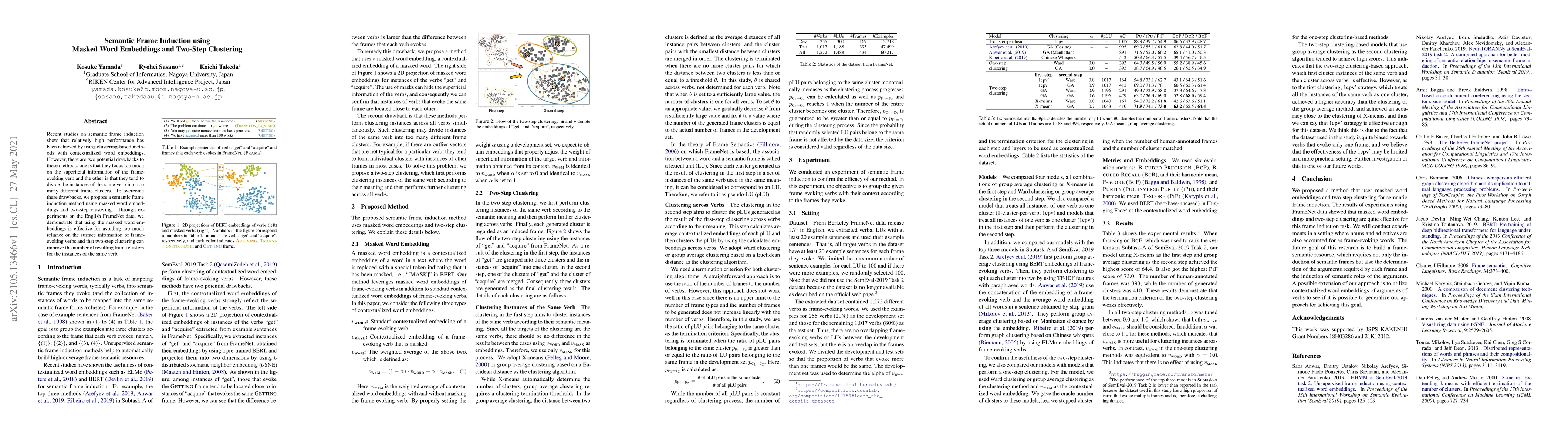 This paper proposes a method for semantic frame induction using masked word embeddings and two-step clustering to address the limitations of existing clustering-based methods. Experiments show that the approach effectively reduces reliance on superficial verb information and improves the clustering of verb instances into appropriate frames.