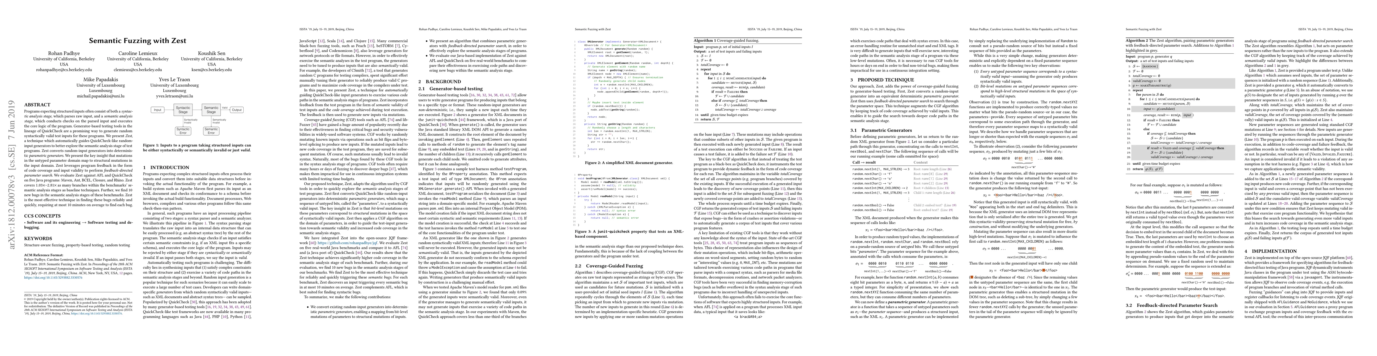 Programs expecting structured inputs often consist of both a syntactic analysis stage, which parses raw input, and a semantic analysis stage, which conducts checks on the parsed input and executes the core logic of the program. Generator-based testing tools in the lineage of QuickCheck are a promising way to generate random syntactically valid test inputs for these programs. We present Zest, a technique which automatically guides QuickCheck-like randominput generators to better explore the semantic analysis stage of test programs. Zest converts random-input generators into deterministic parametric generators. We present the key insight that mutations in the untyped parameter domain map to structural mutations in the input domain. Zest leverages program feedback in the form of code coverage and input validity to perform feedback-directed parameter search. We evaluate Zest against AFL and QuickCheck on five Java programs: Maven, Ant, BCEL, Closure, and Rhino. Zest covers 1.03x-2.81x as many branches within the benchmarks semantic analysis stages as baseline techniques. Further, we find 10 new bugs in the semantic analysis stages of these benchmarks. Zest is the most effective technique in finding these bugs reliably and quickly, requiring at most 10 minutes on average to find each bug.