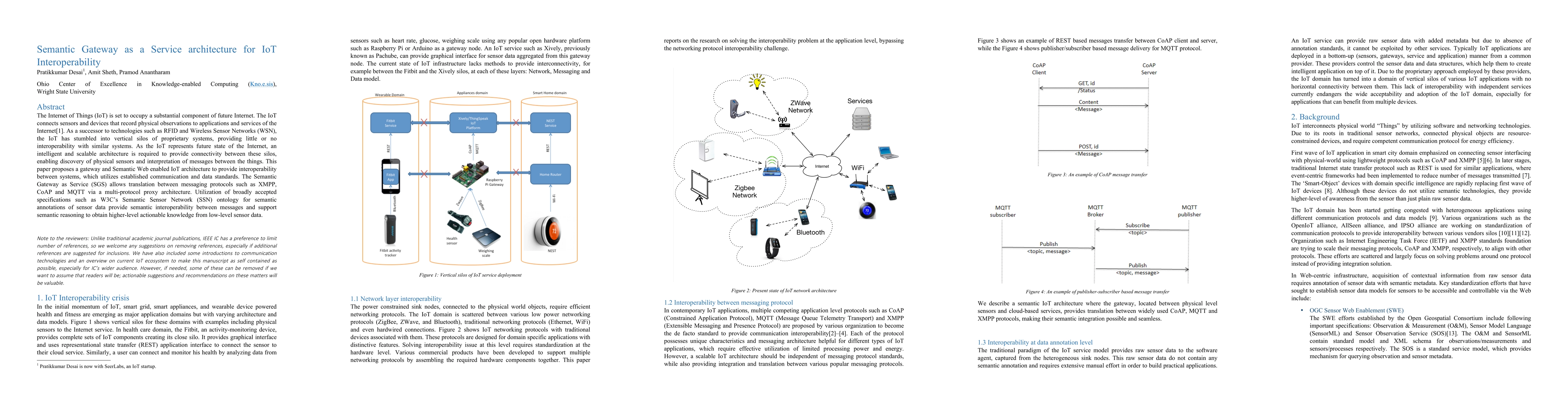 This paper proposes a Semantic Gateway as a Service (SGS) architecture to enhance interoperability in IoT systems by enabling translation between various messaging protocols and utilizing semantic annotations for better data interpretation and reasoning. The SGS architecture aims to connect proprietary IoT systems and facilitate the discovery of physical sensors.