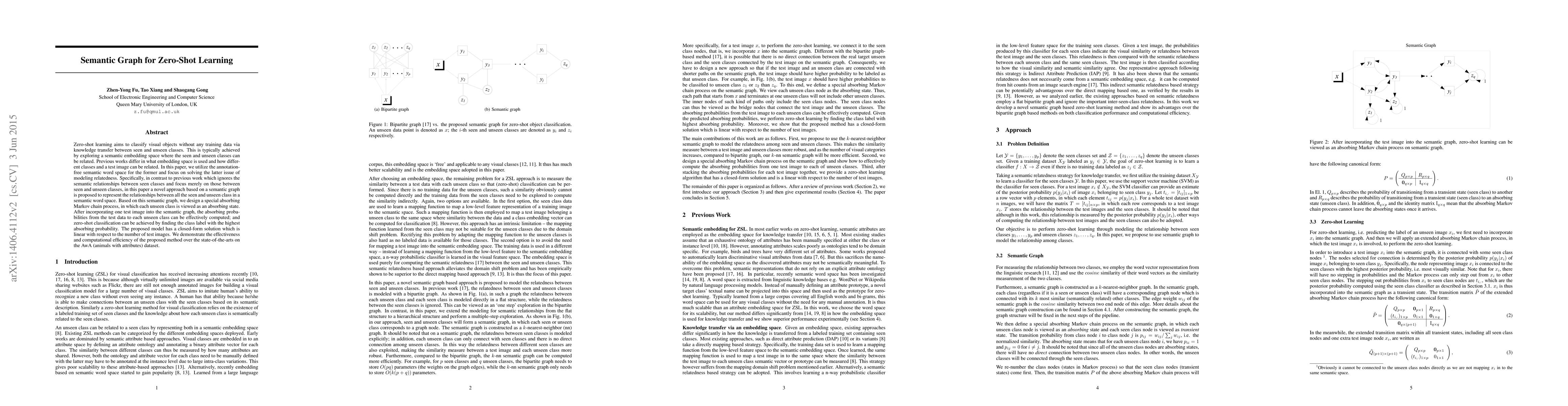 Zero-shot learning aims to classify visual objects without any training data via knowledge transfer between seen and unseen classes. This is typically achieved by exploring a semantic embedding space where the seen and unseen classes can be related. Previous works differ in what embedding space is used and how different classes and a test image can be related. In this paper, we utilize the annotation-free semantic word space for the former and focus on solving the latter issue of modeling relatedness. Specifically, in contrast to previous work which ignores the semantic relationships between seen classes and focus merely on those between seen and unseen classes, in this paper a novel approach based on a semantic graph is proposed to represent the relationships between all the seen and unseen class in a semantic word space. Based on this semantic graph, we design a special absorbing Markov chain process, in which each unseen class is viewed as an absorbing state. After incorporating one test image into the semantic graph, the absorbing probabilities from the test data to each unseen class can be effectively computed; and zero-shot classification can be achieved by finding the class label with the highest absorbing probability. The proposed model has a closed-form solution which is linear with respect to the number of test images. We demonstrate the effectiveness and computational efficiency of the proposed method over the state-of-the-arts on the AwA (animals with attributes) dataset.