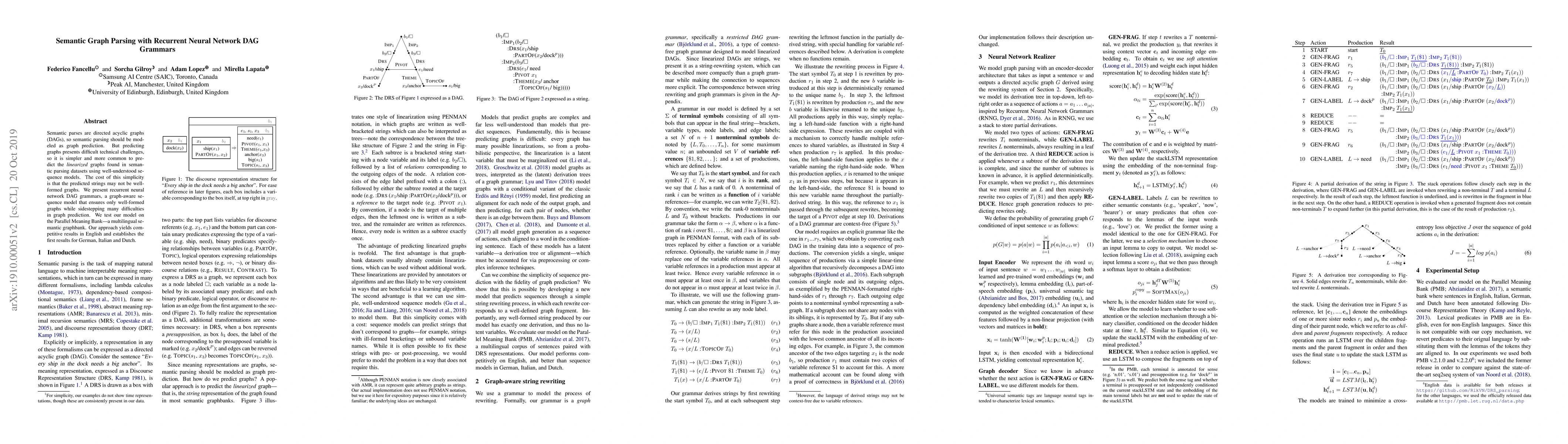 This paper proposes recurrent neural network DAG grammars to model semantic parsing as graph prediction, ensuring well-formed directed acyclic graphs while avoiding complex graph prediction challenges. The model achieves competitive results in English and establishes initial results for German, Italian, and Dutch on the Parallel Meaning Bank.
