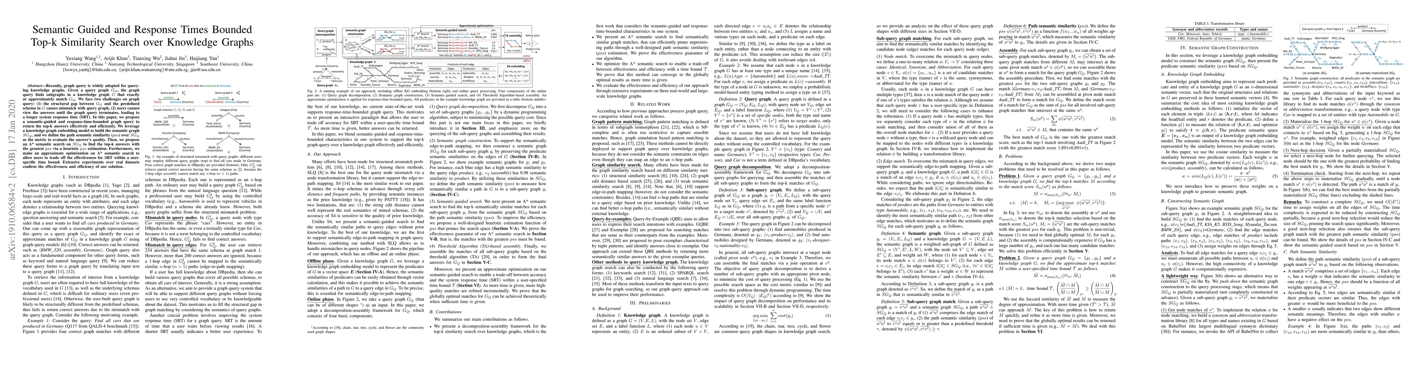 This paper proposes a semantic-guided, response-time-bounded graph query method to efficiently return the top-k subgraphs matching a query graph in knowledge graphs, addressing structural mismatches and long response times through a semantic graph embedding and an optimized A* search.