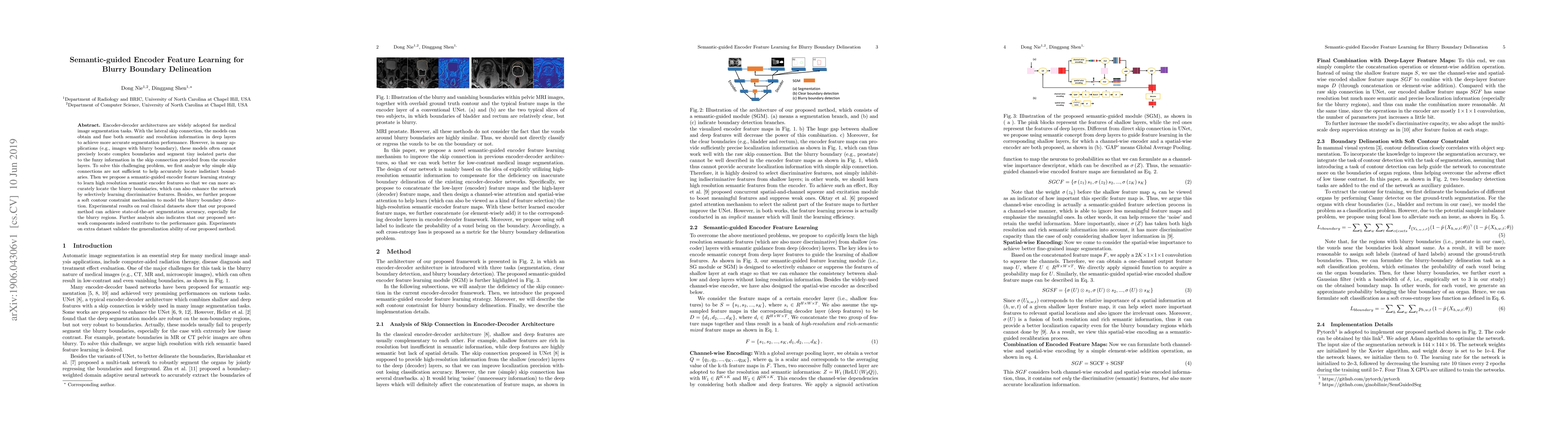 Encoder-decoder architectures are widely adopted for medical image segmentation tasks. With the lateral skip connection, the models can obtain and fuse both semantic and resolution information in deep layers to achieve more accurate segmentation performance. However, in many applications (e.g., blurry boundary images), these models often cannot precisely locate complex boundaries and segment tiny isolated parts. To solve this challenging problem, we firstly analyze why simple skip connections are not enough to help accurately locate indistinct boundaries and argue that it is due to the fuzzy information in the skip connection provided in the encoder layers. Then we propose a semantic-guided encoder feature learning strategy to learn both high resolution and rich semantic encoder features so that we can more accurately locate the blurry boundaries, which can also enhance the network by selectively learning discriminative features. Besides, we further propose a soft contour constraint mechanism to model the blurry boundary detection. Experimental results on real clinical datasets show that our proposed method can achieve state-of-the-art segmentation accuracy, especially for the blurry regions. Further analysis also indicates that our proposed network components indeed contribute to the improvement of performance. Experiments on additional datasets validate the generalization ability of our proposed method.