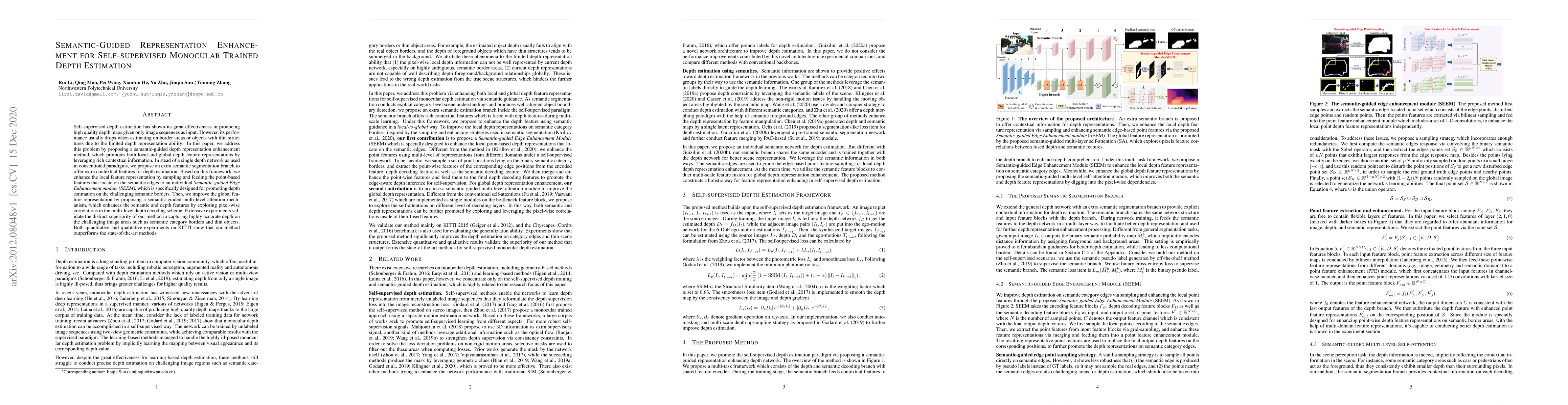This paper proposes a semantic-guided depth representation enhancement method for self-supervised monocular depth estimation, utilizing a semantic segmentation branch to boost both local and global depth feature representations. Experiments demonstrate superior depth estimation accuracy on challenging areas like thin objects and semantic borders, outperforming state-of-the-art methods on the KITTI dataset.