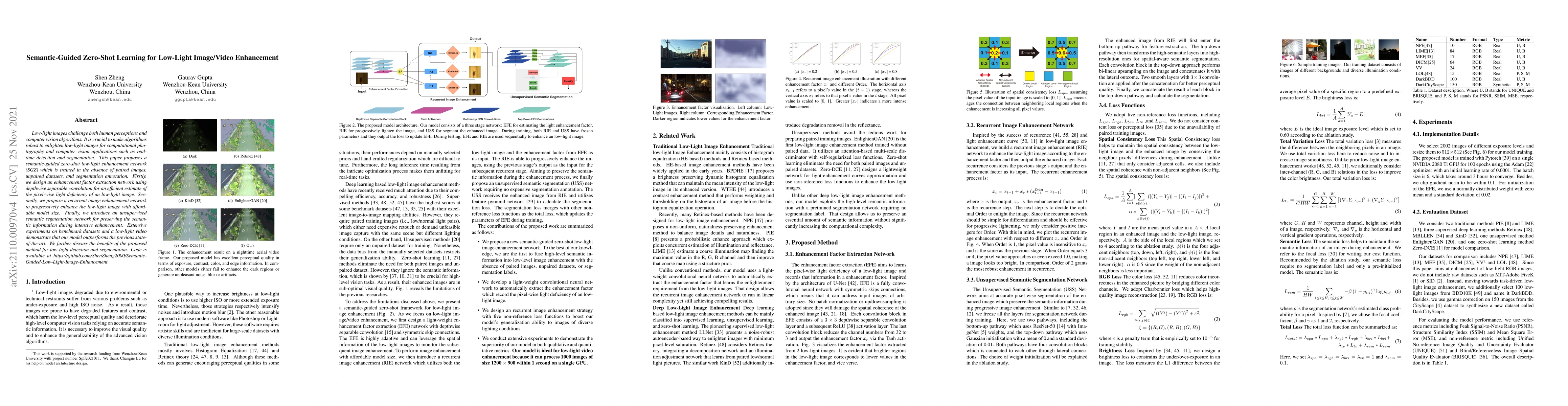 This paper introduces a semantic-guided zero-shot learning network (SGZ) for enhancing low-light images and videos without requiring paired or unpaired datasets, leveraging depthwise separable convolutions and recurrent networks for efficient enhancement. The method preserves semantic information through an unsupervised semantic segmentation network, outperforming previous methods on benchmark datasets.