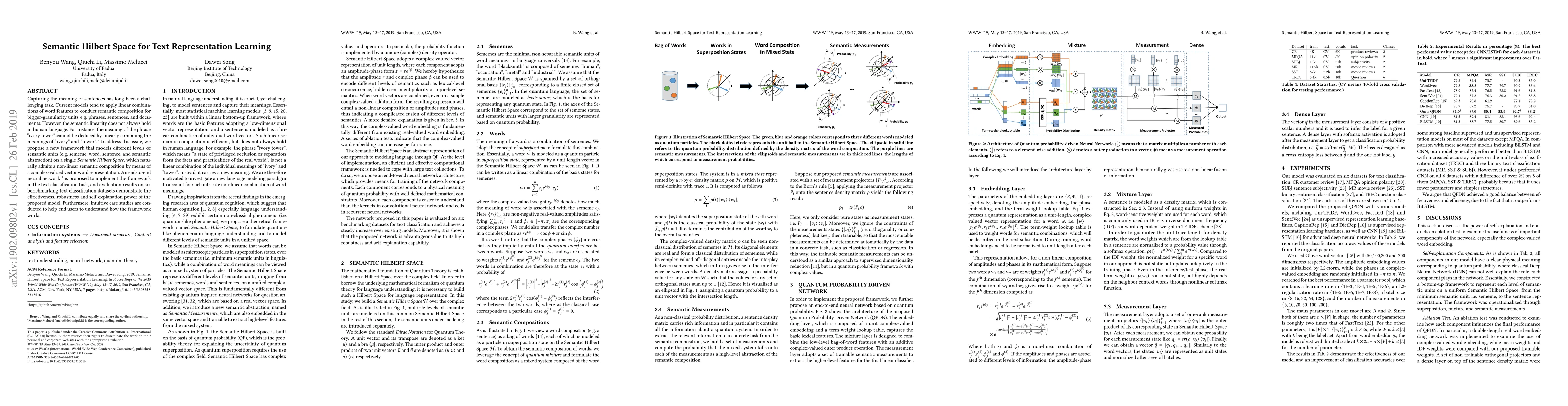 Capturing the meaning of sentences has long been a challenging task. Current models tend to apply linear combinations of word features to conduct semantic composition for bigger-granularity units e.g. phrases, sentences, and documents. However, the semantic linearity does not always hold in human language. For instance, the meaning of the phrase `ivory tower' can not be deduced by linearly combining the meanings of `ivory' and `tower'. To address this issue, we propose a new framework that models different levels of semantic units (e.g. sememe, word, sentence, and semantic abstraction) on a single \textit{Semantic Hilbert Space}, which naturally admits a non-linear semantic composition by means of a complex-valued vector word representation. An end-to-end neural network~\footnote{https://github.com/wabyking/qnn} is proposed to implement the framework in the text classification task, and evaluation results on six benchmarking text classification datasets demonstrate the effectiveness, robustness and self-explanation power of the proposed model. Furthermore, intuitive case studies are conducted to help end users to understand how the framework works.
