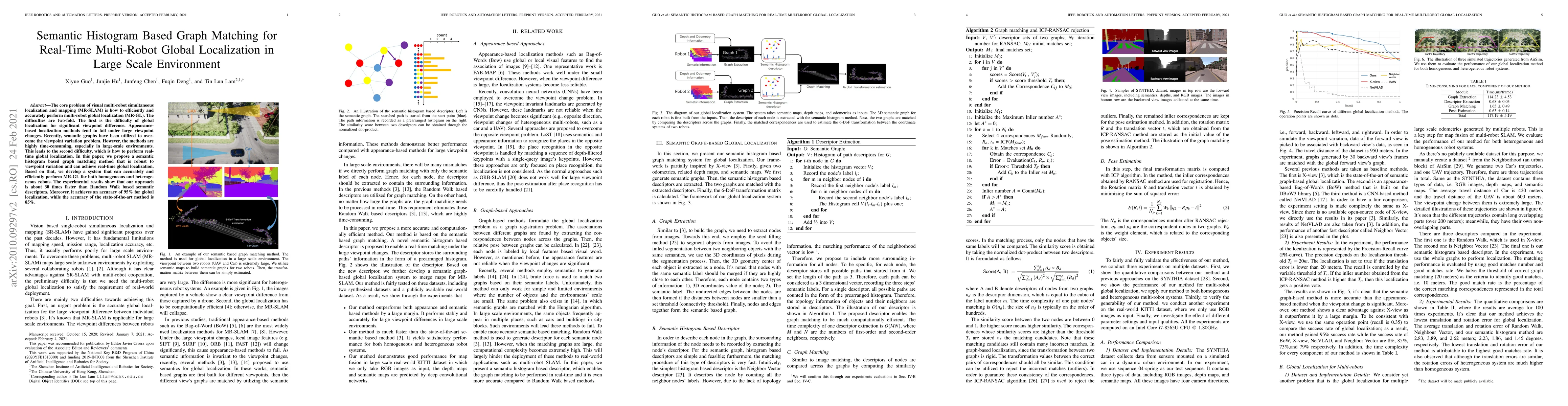 This paper proposes a semantic histogram-based graph matching method for real-time global localization in multi-robot systems, addressing challenges of large viewpoint differences and computational efficiency. The method achieves 30 times faster performance and 95% accuracy compared to the state-of-the-art.