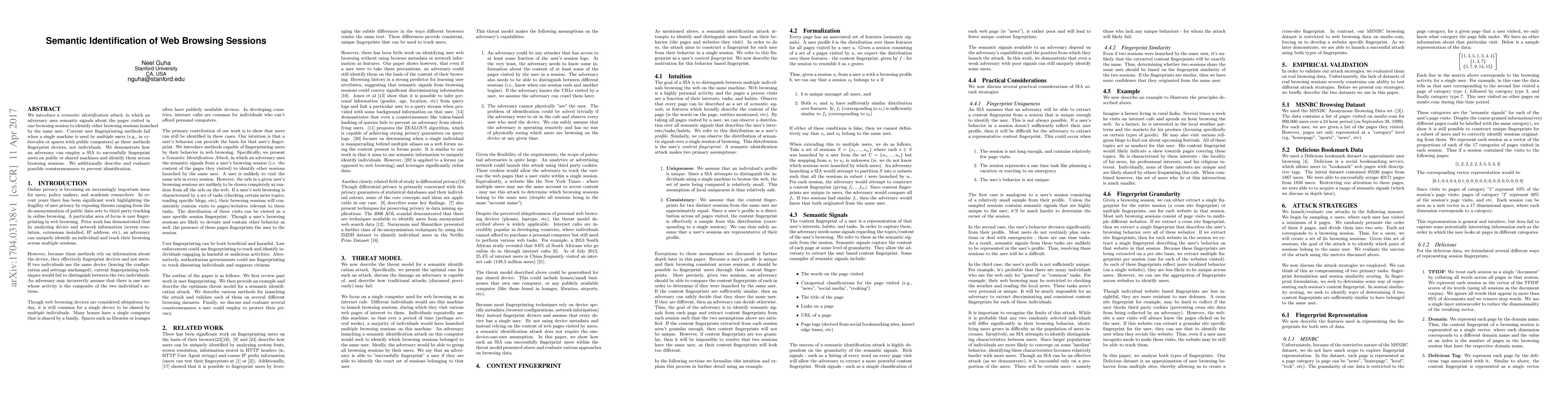 This paper introduces a semantic identification attack (SIA) that allows an adversary to identify users across different web browsing sessions on shared machines by analyzing semantic signals from visited pages. It also discusses countermeasures to prevent such identification.