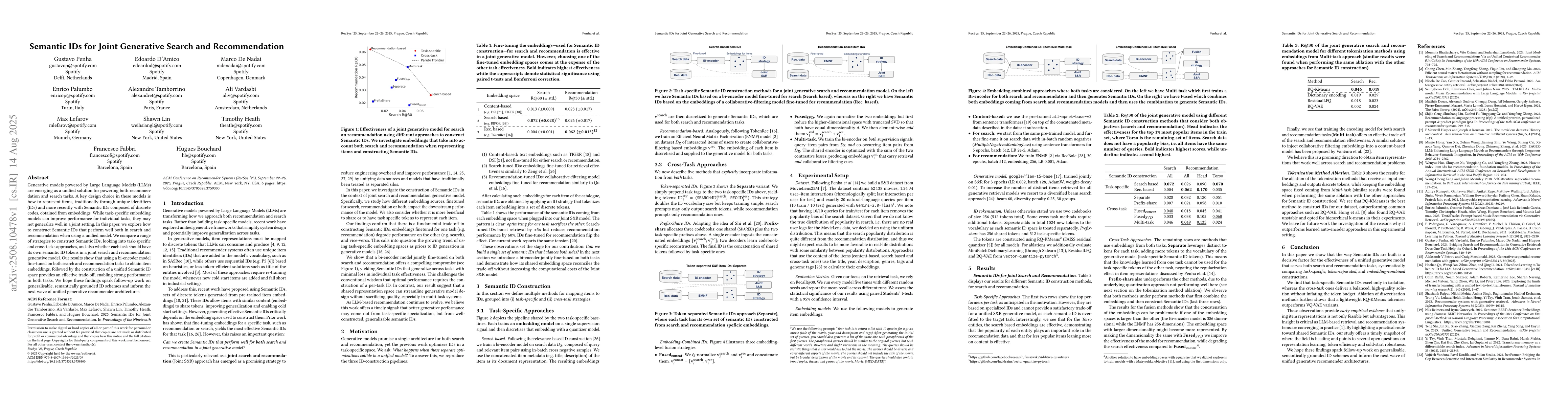 Generative models powered by Large Language Models (LLMs) are emerging as a unified solution for powering both recommendation and search tasks. A key design choice in these models is how to represent items, traditionally through unique identifiers (IDs) and more recently with Semantic IDs composed of discrete codes, obtained from embeddings. While task-specific embedding models can improve performance for individual tasks, they may not generalize well in a joint setting. In this paper, we explore how to construct Semantic IDs that perform well both in search and recommendation when using a unified model. We compare a range of strategies to construct Semantic IDs, looking into task-specific and cross-tasks approaches, and also whether each task should have its own semantic ID tokens in a joint search and recommendation generative model. Our results show that using a bi-encoder model fine-tuned on both search and recommendation tasks to obtain item embeddings, followed by the construction of a unified Semantic ID space provides an effective trade-off, enabling strong performance in both tasks. We hope these findings spark follow-up work on generalisable, semantically grounded ID schemes and inform the next wave of unified generative recommender architectures.