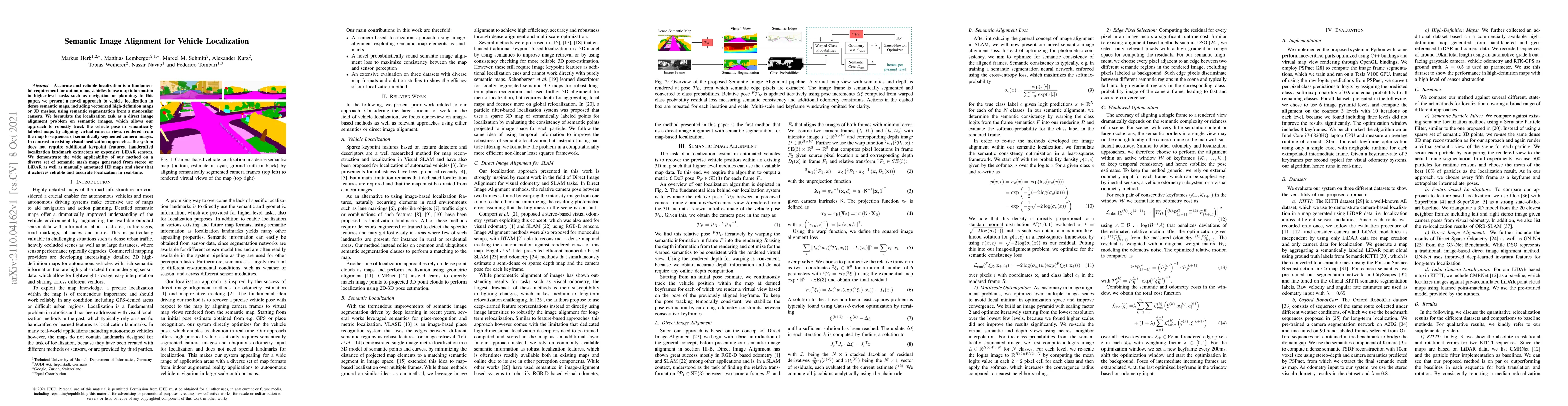 The paper presents a novel approach for vehicle localization using semantic image alignment. It formulates the localization task as a direct image alignment problem on semantic images, aligning virtual camera views rendered from the map to sequences of semantically segmented camera images. The method does not require additional keypoint features, handcrafted localization landmarks, or expensive LiDAR sensors.