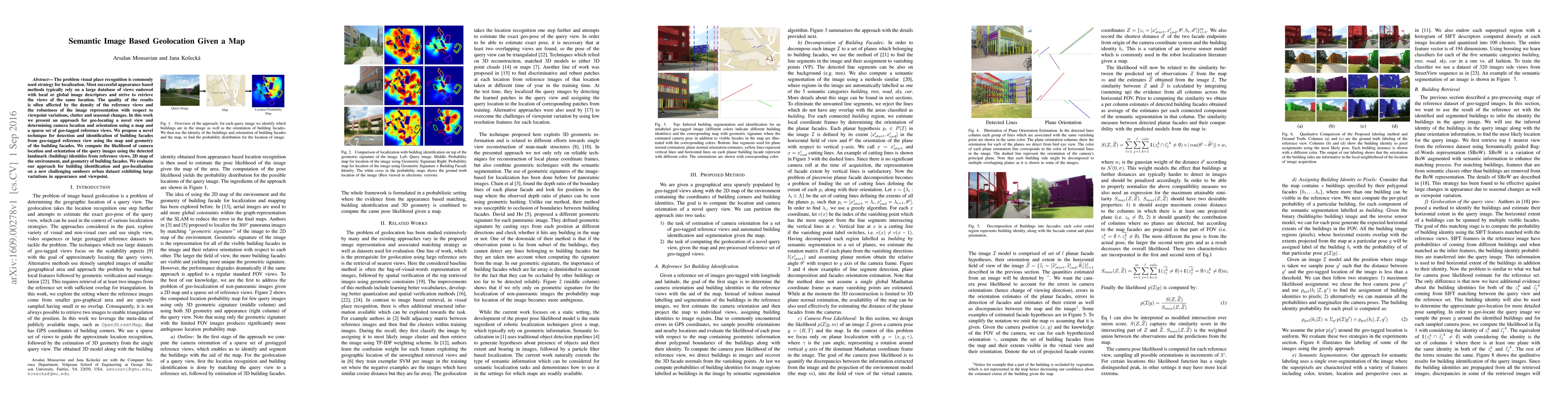 The problem visual place recognition is commonly used strategy for localization. Most successful appearance based methods typically rely on a large database of views endowed with local or global image descriptors and strive to retrieve the views of the same location. The quality of the results is often affected by the density of the reference views and the robustness of the image representation with respect to viewpoint variations, clutter and seasonal changes. In this work we present an approach for geo-locating a novel view and determining camera location and orientation using a map and a sparse set of geo-tagged reference views. We propose a novel technique for detection and identification of building facades from geo-tagged reference view using the map and geometry of the building facades. We compute the likelihood of camera location and orientation of the query images using the detected landmark (building) identities from reference views, 2D map of the environment, and geometry of building facades. We evaluate our approach for building identification and geo-localization on a new challenging outdoors urban dataset exhibiting large variations in appearance and viewpoint.