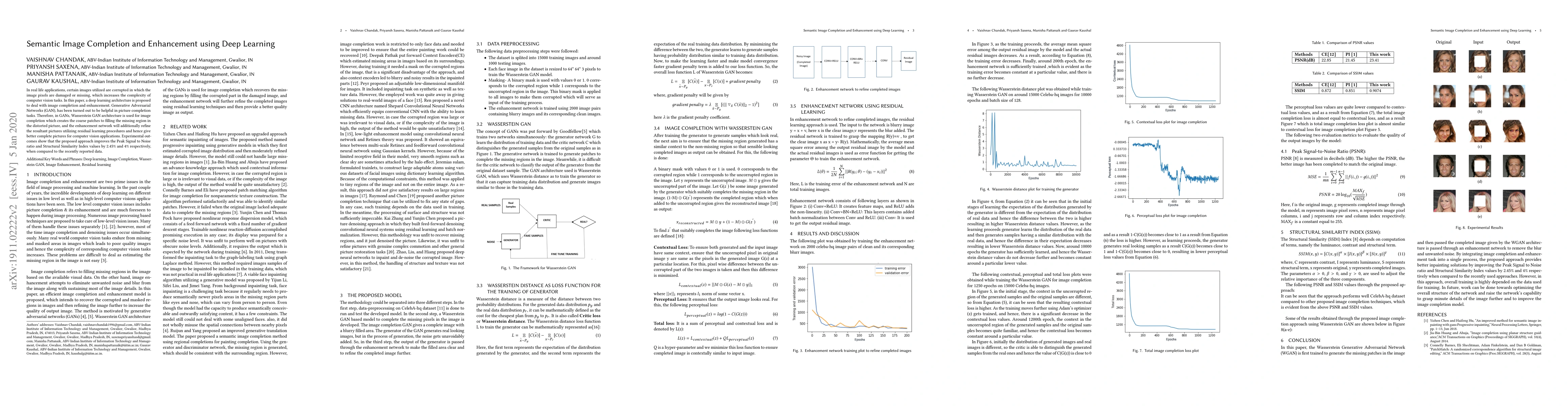 This research paper proposes a deep learning architecture using Generative Adversarial Networks to improve image completion and enhancement, resulting in improved Peak Signal to Noise ratio and Structural Similarity Index values.