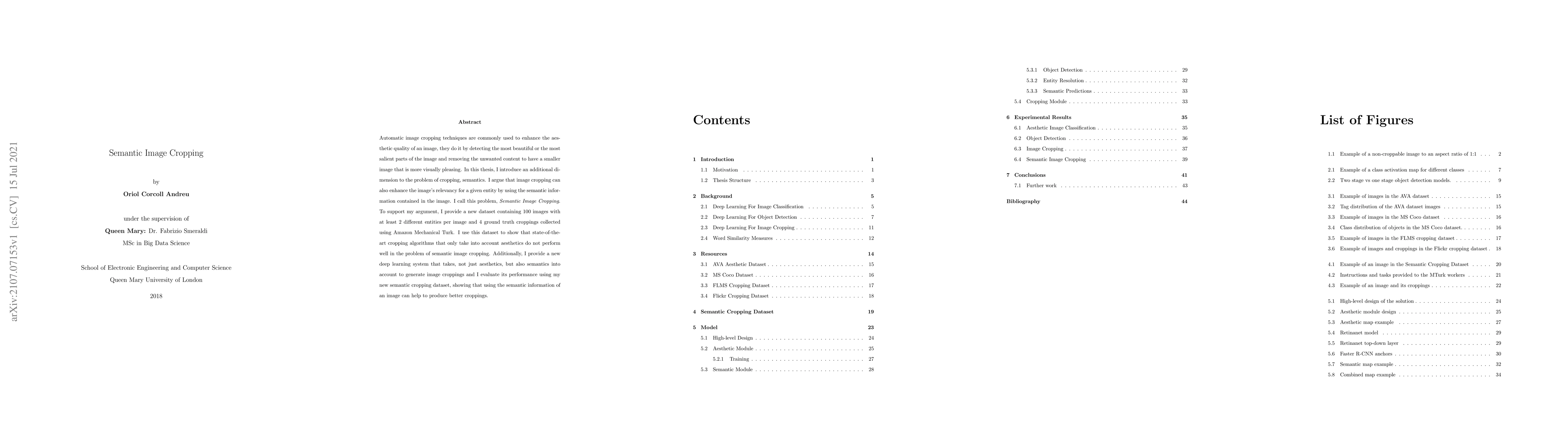 This paper introduces Semantic Image Cropping, a method that enhances image relevancy for specific entities by incorporating semantic information. The author proposes a new dataset and a deep learning system that outperform traditional aesthetic-based cropping algorithms, demonstrating the benefits of semantic cropping.