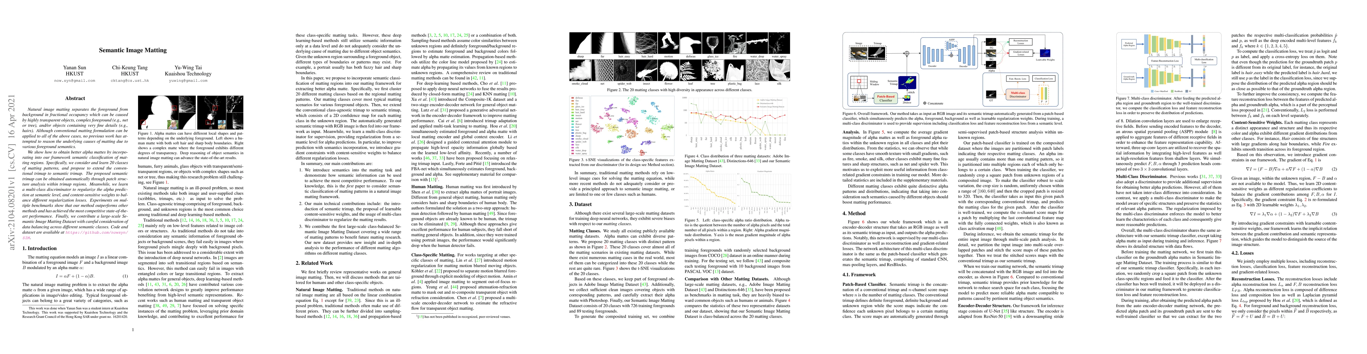 This paper proposes a semantic image matting method that improves alpha mattes by incorporating semantic classification of matting regions, learning 20 classes of matting patterns, and extending the conventional trimap to a semantic trimap. The method achieves state-of-the-art performance and introduces a new dataset for balanced semantic matting.