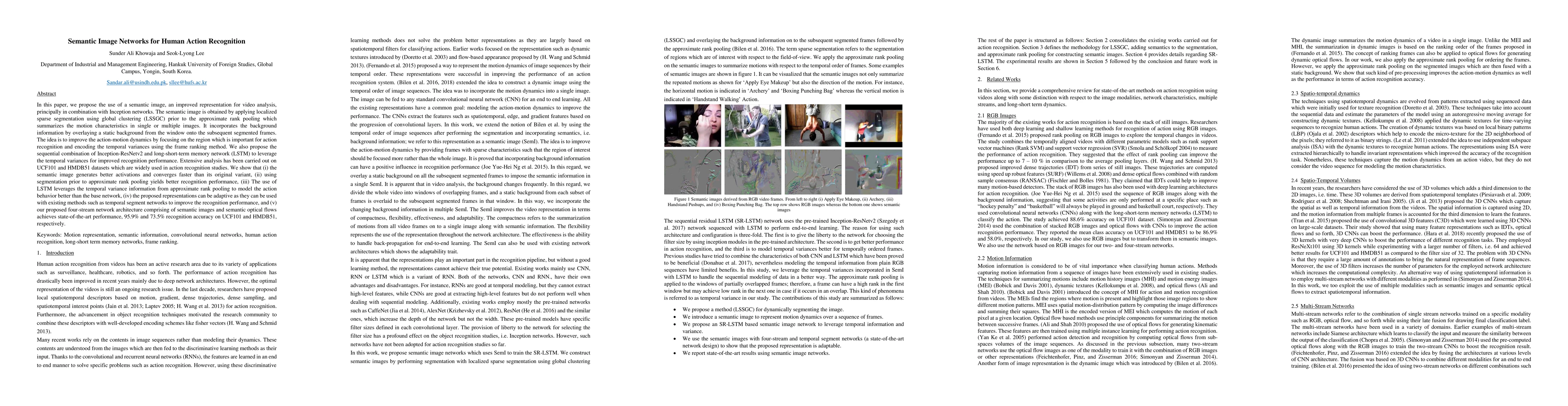 This paper introduces a semantic image representation for enhanced human action recognition using Inception networks and LSTM. The method combines localized sparse segmentation and approximate rank pooling, achieving state-of-the-art results on UCF101 and HMDB51 datasets with 95.9% and 73.5% accuracy, respectively.