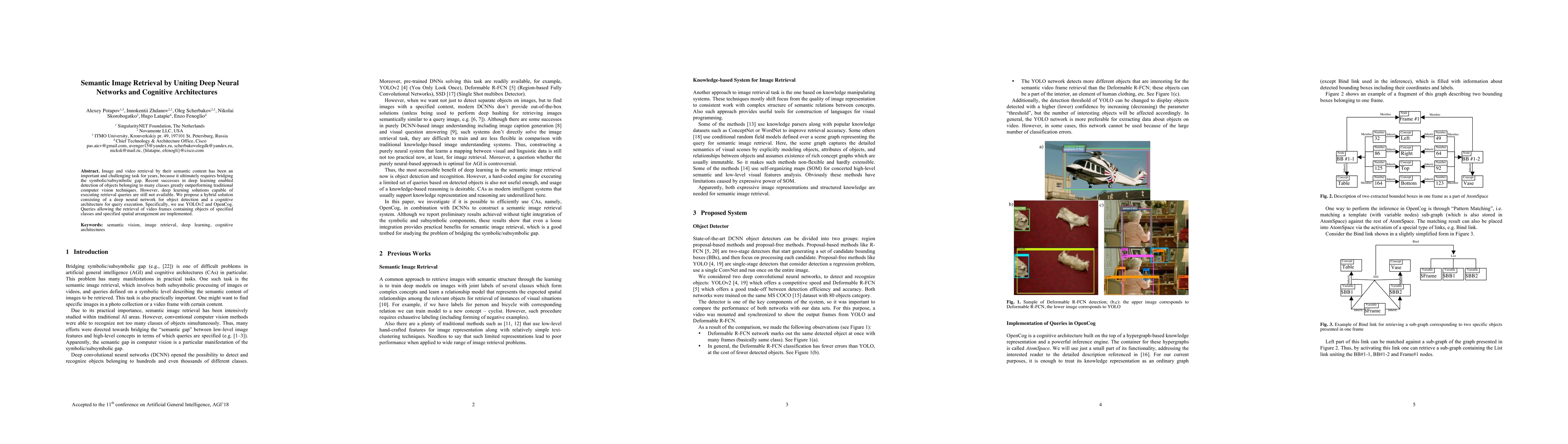 This paper proposes a hybrid approach combining deep neural networks and cognitive architectures for semantic image retrieval. It utilizes YOLOv2 for object detection and OpenCog for executing retrieval queries, enabling the retrieval of video frames based on specified object classes and spatial arrangements.
