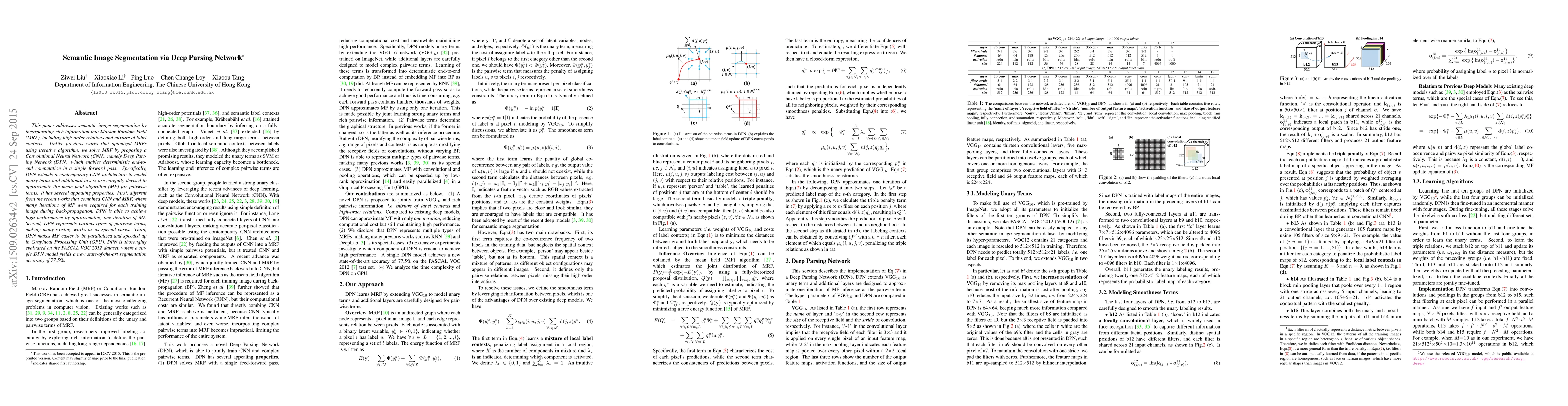 This paper addresses semantic image segmentation by incorporating rich information into Markov Random Field (MRF), including high-order relations and mixture of label contexts. Unlike previous works that optimized MRFs using iterative algorithm, we solve MRF by proposing a Convolutional Neural Network (CNN), namely Deep Parsing Network (DPN), which enables deterministic end-to-end computation in a single forward pass. Specifically, DPN extends a contemporary CNN architecture to model unary terms and additional layers are carefully devised to approximate the mean field algorithm (MF) for pairwise terms. It has several appealing properties. First, different from the recent works that combined CNN and MRF, where many iterations of MF were required for each training image during back-propagation, DPN is able to achieve high performance by approximating one iteration of MF. Second, DPN represents various types of pairwise terms, making many existing works as its special cases. Third, DPN makes MF easier to be parallelized and speeded up in Graphical Processing Unit (GPU). DPN is thoroughly evaluated on the PASCAL VOC 2012 dataset, where a single DPN model yields a new state-of-the-art segmentation accuracy.