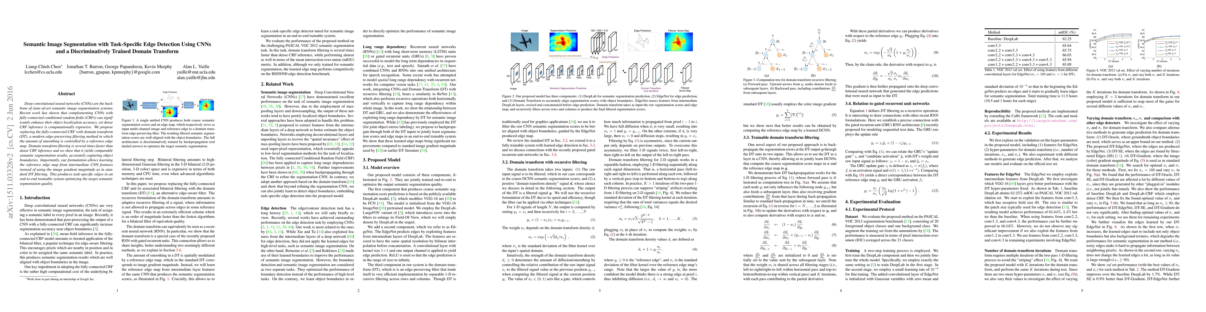 This paper proposes a method for semantic image segmentation using CNNs enhanced by a domain transform (DT) instead of fully-connected CRFs, achieving faster computation while maintaining segmentation accuracy. The DT method uses a reference edge map derived from CNN features, enabling task-specific edge detection in an end-to-end trainable system.