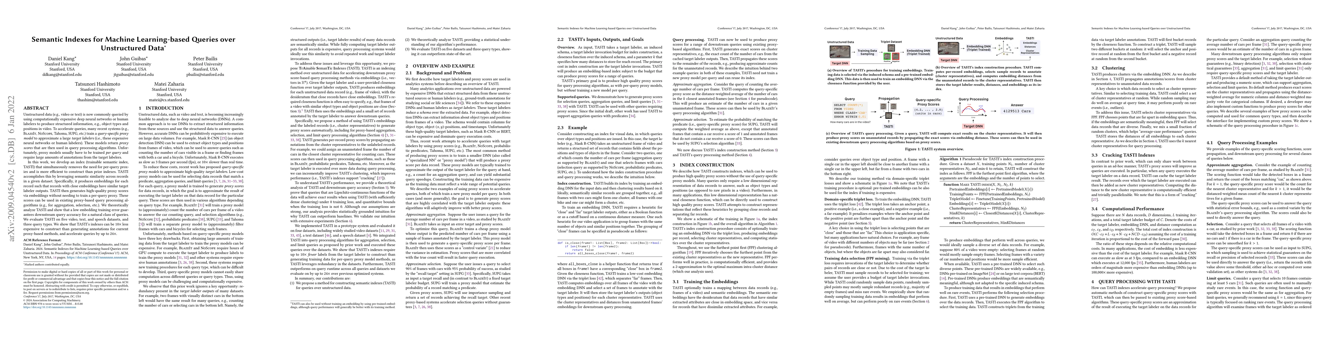 Unstructured data (e.g., video or text) is now commonly queried by using computationally expensive deep neural networks or human labelers to produce structured information, e.g., object types and positions in video. To accelerate queries, many recent systems (e.g., BlazeIt, NoScope, Tahoma, SUPG, etc.) train a query-specific proxy model to approximate a large target labelers (i.e., these expensive neural networks or human labelers). These models return proxy scores that are then used in query processing algorithms. Unfortunately, proxy models usually have to be trained per query and require large amounts of annotations from the target labelers. In this work, we develop an index (trainable semantic index, TASTI) that simultaneously removes the need for per-query proxies and is more efficient to construct than prior indexes. TASTI accomplishes this by leveraging semantic similarity across records in a given dataset. Specifically, it produces embeddings for each record such that records with close embeddings have similar target labeler outputs. TASTI then generates high-quality proxy scores via embeddings without needing to train a per-query proxy. These scores can be used in existing proxy-based query processing algorithms (e.g., for aggregation, selection, etc.). We theoretically analyze TASTI and show that a low embedding training error guarantees downstream query accuracy for a natural class of queries. We evaluate TASTI on five video, text, and speech datasets, and three query types. We show that TASTI's indexes can be 10$\times$ less expensive to construct than generating annotations for current proxy-based methods, and accelerate queries by up to 24$\times$.