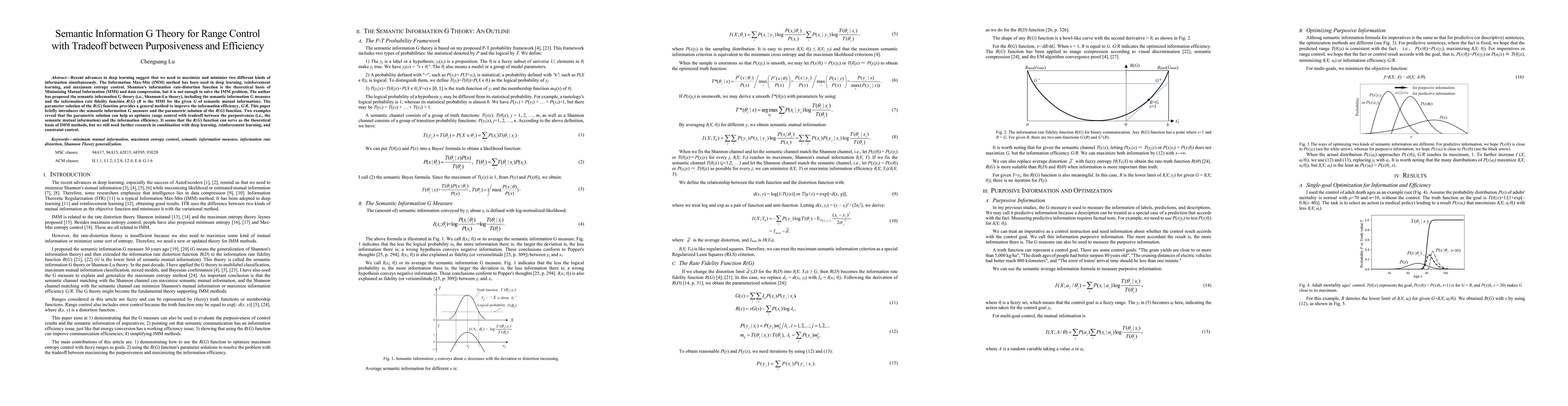 This paper introduces the semantic information G theory, including the G measure and R(G) function, to address the dual optimization of purposiveness and efficiency in deep learning and control systems. The proposed R(G) function offers a method to balance semantic mutual information and information efficiency, optimizing range control by leveraging a theoretical foundation for Information Max-Min methods.