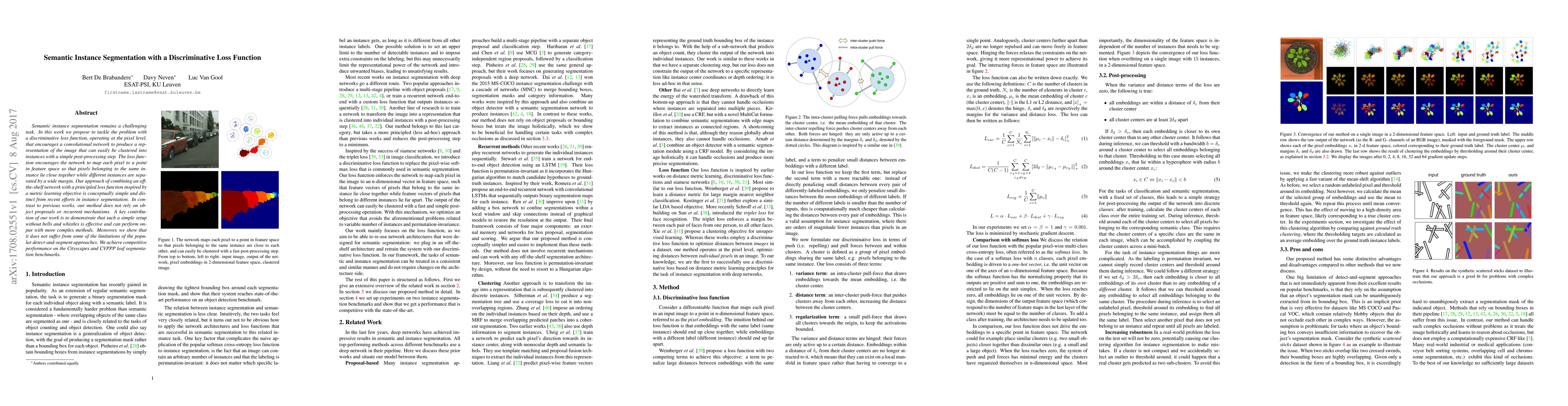 This paper proposes a discriminative loss function for semantic instance segmentation that operates at the pixel level, encouraging the network to cluster instances effectively post-processing. The method achieves competitive performance on benchmarks without relying on object proposals or recurrent mechanisms, demonstrating the effectiveness of a simple yet principled approach.