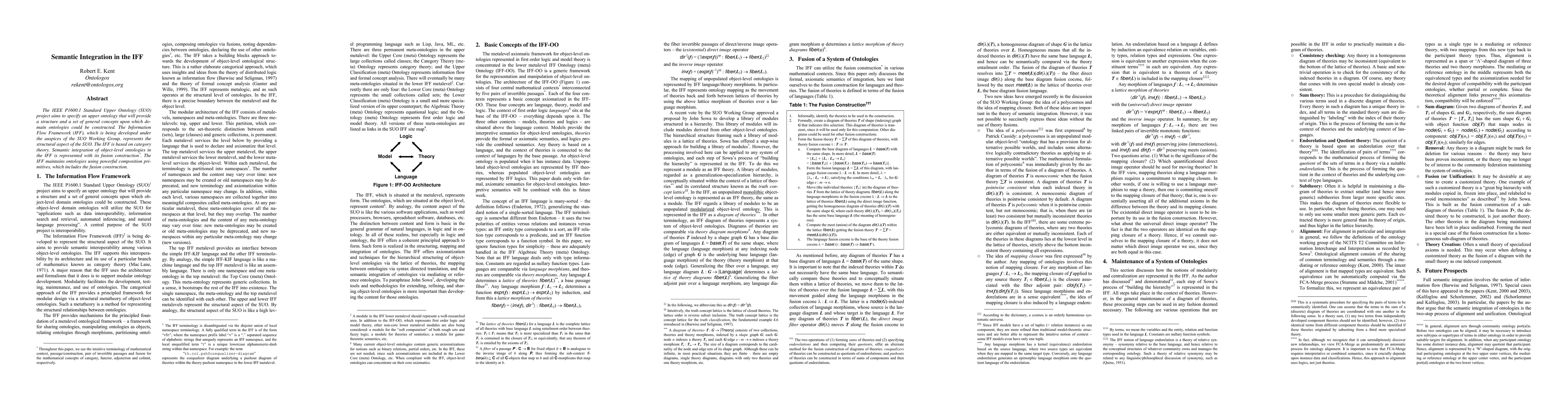 The IFF provides a principled framework for semantic integration of ontologies, utilizing fusion construction, lattice of theories, and syntax-directed translation.