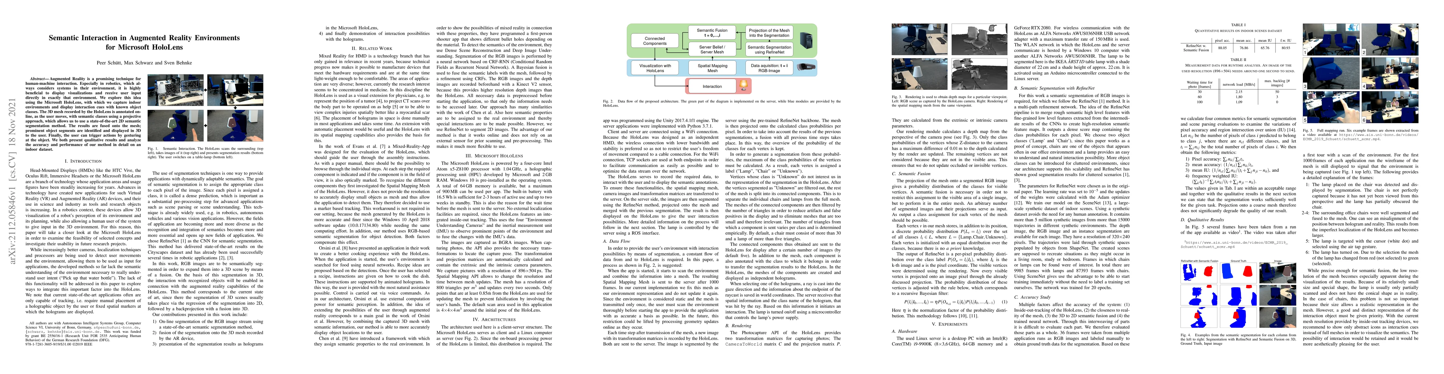 Augmented Reality is a promising technique for human-machine interaction. Especially in robotics, which always considers systems in their environment, it is highly beneficial to display visualizations and receive user input directly in exactly that environment. We explore this idea using the Microsoft HoloLens, with which we capture indoor environments and display interaction cues with known object classes. The 3D mesh recorded by the HoloLens is annotated on-line, as the user moves, with semantic classes using a projective approach, which allows us to use a state-of-the-art 2D semantic segmentation method. The results are fused onto the mesh; prominent object segments are identified and displayed in 3D to the user. Finally, the user can trigger actions by gesturing at the object. We both present qualitative results and analyze the accuracy and performance of our method in detail on an indoor dataset.