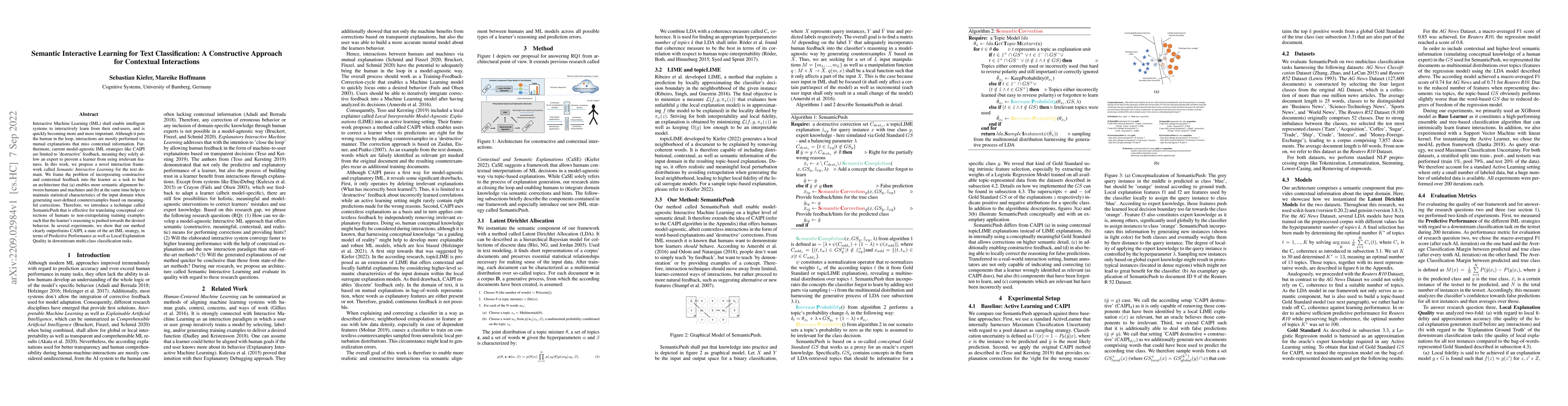 This paper proposes Semantic Interactive Learning, a framework for incorporating constructive and contextual feedback in text classification, aiming to enhance semantic alignment between humans and machines. The introduced SemanticPush technique translates human corrections into non-extrapolating training examples, improving predictive performance and local explanation quality compared to existing model-agnostic IML strategies.