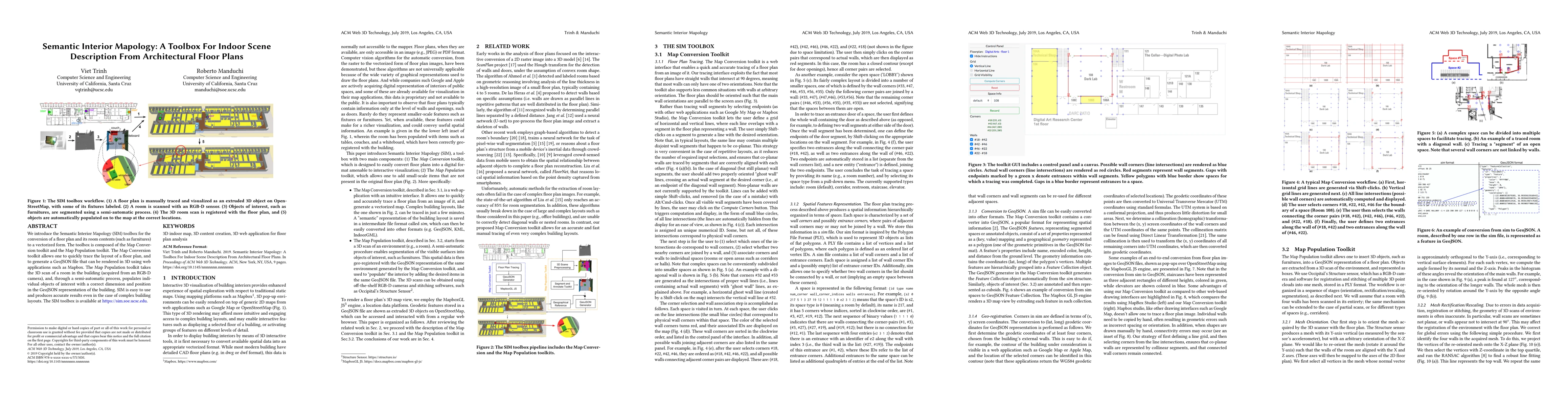 We introduce the Semantic Interior Mapology (SIM) toolbox for the conversion of a floor plan and its room contents (such as furnitures) to a vectorized form. The toolbox is composed of the Map Conversion toolkit and the Map Population toolkit. The Map Conversion toolkit allows one to quickly trace the layout of a floor plan, and to generate a GeoJSON file that can be rendered in 3D using web applications such as Mapbox. The Map Population toolkit takes the 3D scan of a room in the building (acquired from an RGB-D camera), and, through a semi-automatic process, populates individual objects of interest with a correct dimension and position in the GeoJSON representation of the building. SIM is easy to use and produces accurate results even in the case of complex building layouts.