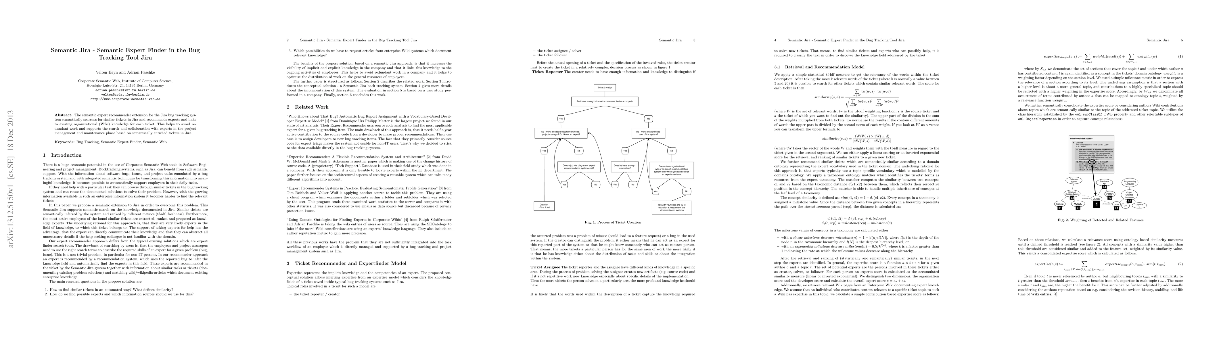 The semantic expert recommender extension for the Jira bug tracking system semantically searches for similar tickets in Jira and recommends experts and links to existing organizational (Wiki) knowledge for each ticket. This helps to avoid redundant work and supports the search and collaboration with experts in the project management and maintenance phase based on semantically enriched tickets in Jira.