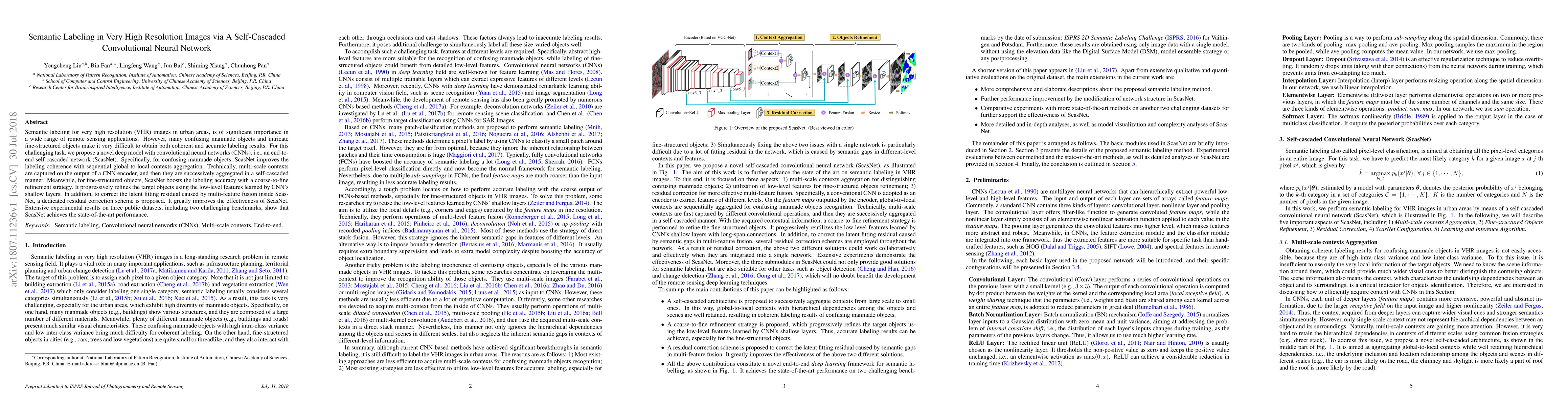 This paper proposes a self-cascaded convolutional neural network (ScasNet) for semantic labeling of very high resolution images, enhancing both coherence for manmade objects and accuracy for fine-structured objects through global-to-local context aggregation and coarse-to-fine refinement. ScasNet achieves state-of-the-art performance on three public datasets.