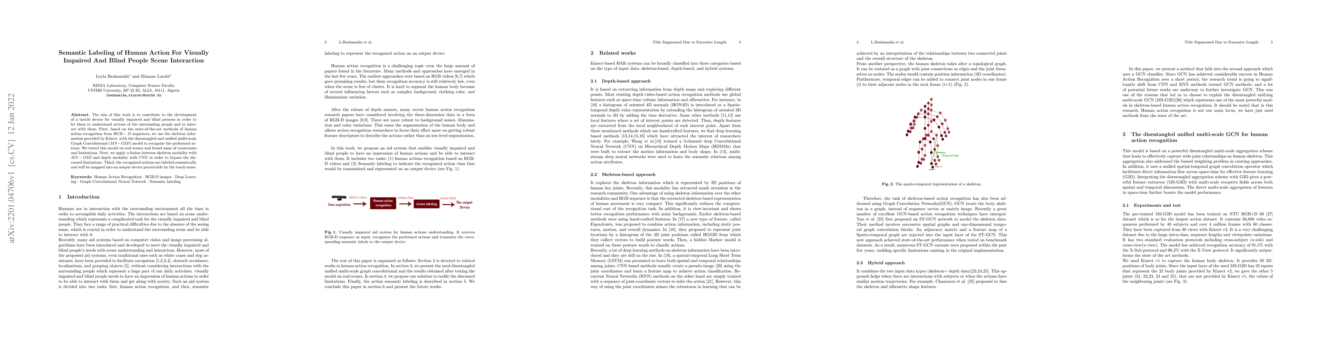 The aim of this work is to contribute to the development of a tactile device for visually impaired and blind persons in order to let them to understand actions of the surrounding people and to interact with them. First, based on the state-of-the-art methods of human action recognition from RGB-D sequences, we use the skeleton information provided by Kinect, with the disentangled and unified multi-scale Graph Convolutional (MS-G3D) model to recognize the performed actions. We tested this model on real scenes and found some of constraints and limitations. Next, we apply a fusion between skeleton modality with MS-G3D and depth modality with CNN in order to bypass the discussed limitations. Third, the recognized actions are labeled semantically and will be mapped into an output device perceivable by the touch sense.