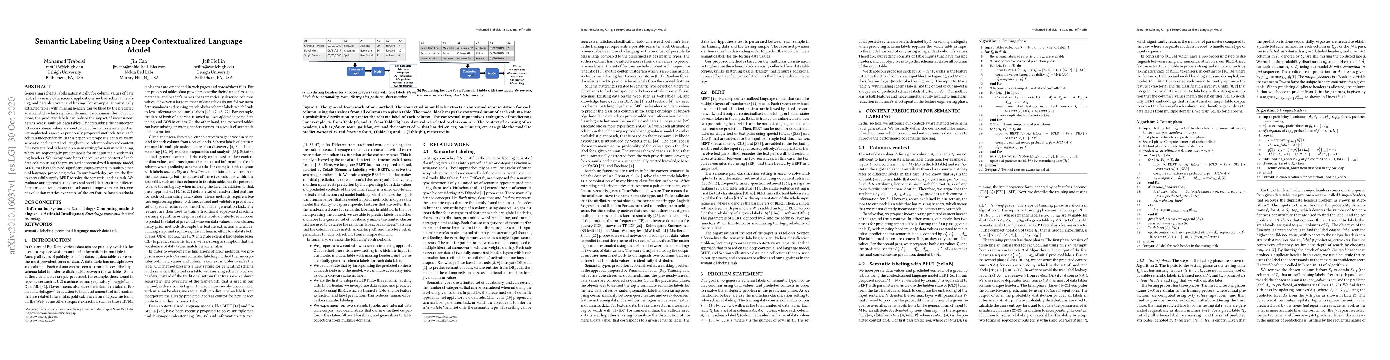 This paper proposes a context-aware semantic labeling method using BERT to generate schema labels for data table columns, leveraging both column values and contextual information. The approach shows significant improvements over existing feature-based methods in real-world datasets.