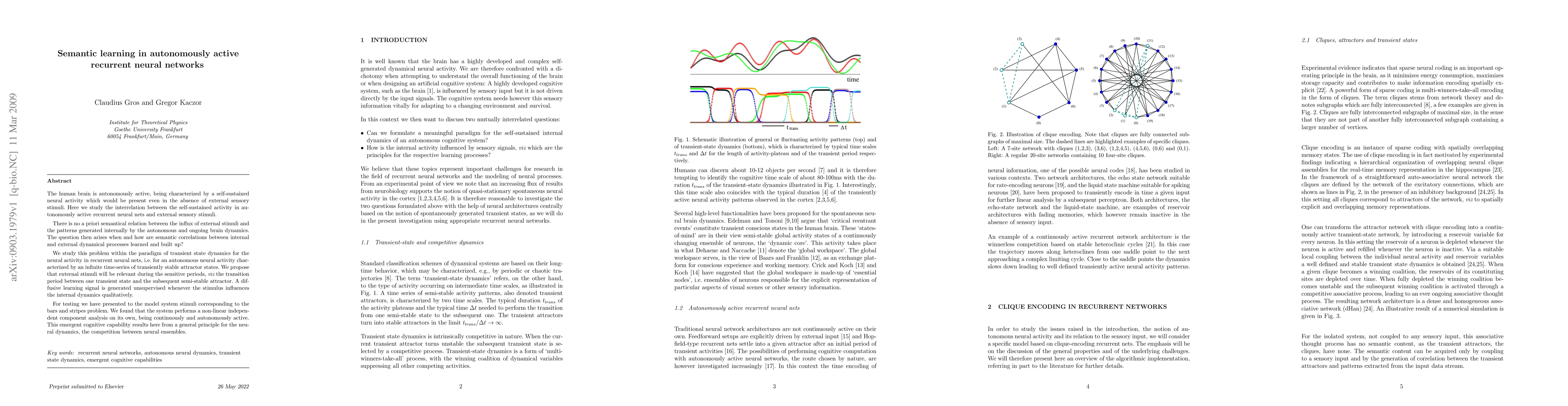 The human brain is autonomously active, being characterized by a self-sustained neural activity which would be present even in the absence of external sensory stimuli. Here we study the interrelation between the self-sustained activity in autonomously active recurrent neural nets and external sensory stimuli. There is no a priori semantical relation between the influx of external stimuli and the patterns generated internally by the autonomous and ongoing brain dynamics. The question then arises when and how are semantic correlations between internal and external dynamical processes learned and built up? We study this problem within the paradigm of transient state dynamics for the neural activity in recurrent neural nets, i.e. for an autonomous neural activity characterized by an infinite time-series of transiently stable attractor states. We propose that external stimuli will be relevant during the sensitive periods, {\it viz} the transition period between one transient state and the subsequent semi-stable attractor. A diffusive learning signal is generated unsupervised whenever the stimulus influences the internal dynamics qualitatively. For testing we have presented to the model system stimuli corresponding to the bars and stripes problem. We found that the system performs a non-linear independent component analysis on its own, being continuously and autonomously active. This emergent cognitive capability results here from a general principle for the neural dynamics, the competition between neural ensembles.