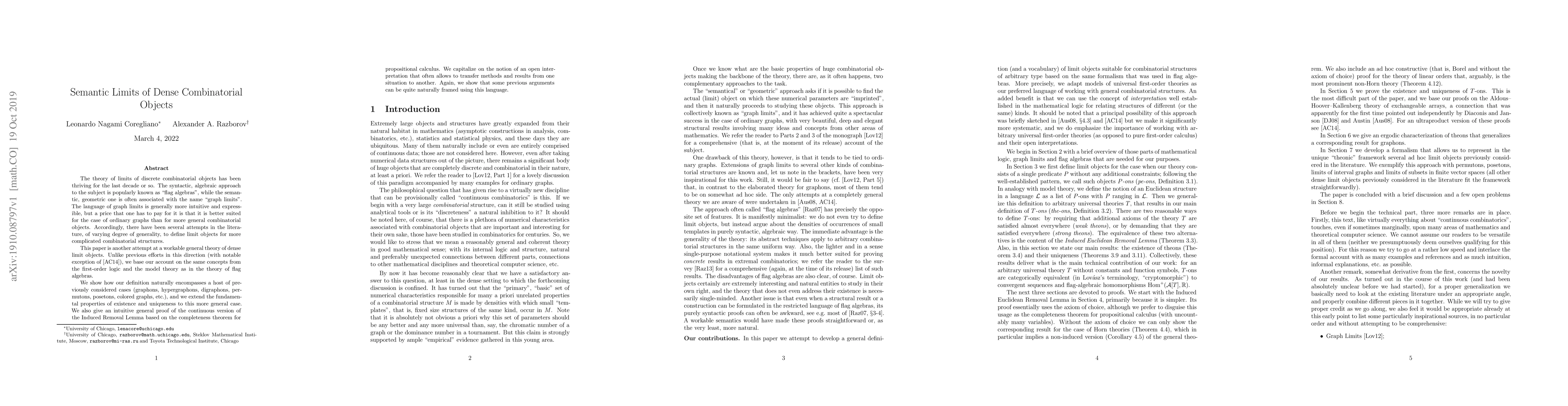 This paper presents a general theory of dense limit objects in combinatorial structures, extending flag algebras to encompass various cases like graphons, hypergraphons, and colored graphs, while also providing an intuitive proof of the Induced Removal Lemma.