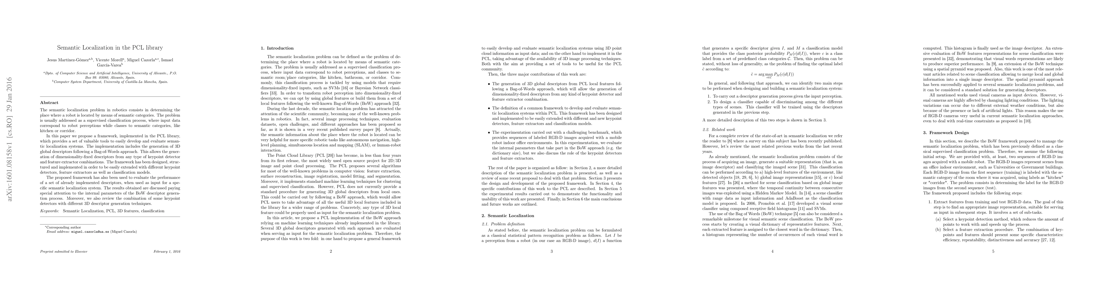 This paper introduces a framework in the PCL library for semantic localization, using 3D global descriptors via Bag-of-Words approach. The framework supports various keypoint detectors, feature extractors, and classification models, and evaluates descriptor performance with different keypoint detector and descriptor generation technique combinations.