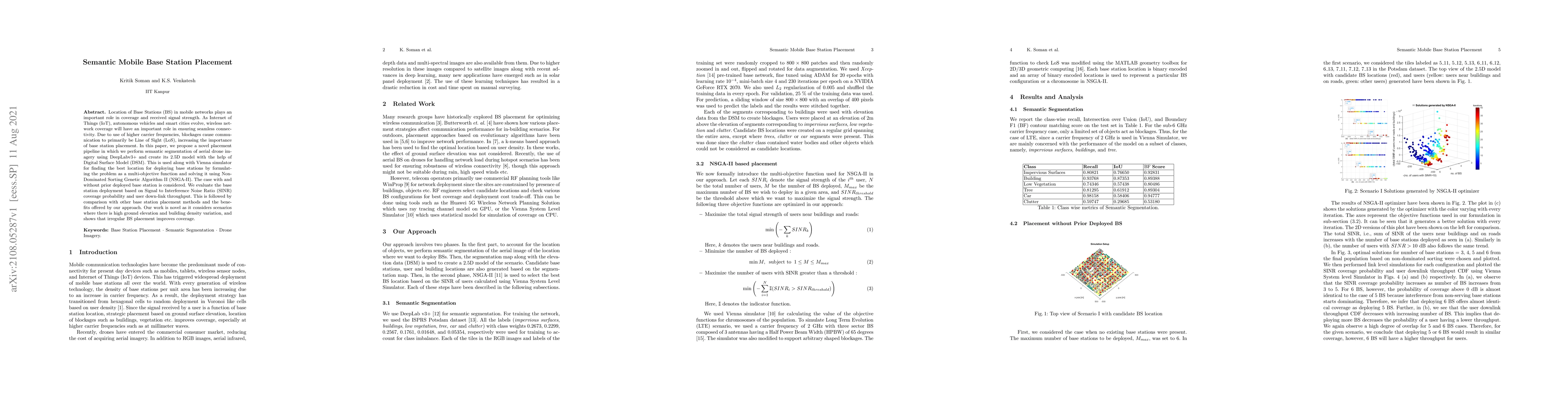 Location of Base Stations (BS) in mobile networks plays an important role in coverage and received signal strength. As Internet ofThings (IoT), autonomous vehicles and smart cities evolve, wireless net-work coverage will have an important role in ensuring seamless connectivity. Due to use of higher carrier frequencies, blockages cause communication to primarily be Line of Sight (LoS), increasing the importance of base station placement. In this paper, we propose a novel placement pipeline in which we perform semantic segmentation of aerial drone imagery using DeepLabv3+ and create its 2.5D model with the help ofDigital Surface Model (DSM). This is used along with Vienna simulator for finding the best location for deploying base stations by formulating the problem as a multi-objective function and solving it using Non-Dominated Sorting Genetic Algorithm II (NSGA-II). The case with and without prior deployed base station is considered. We evaluate the basestation deployment based on Signal to Interference Noise Ratio (SINR)coverage probability and user down-link throughput. This is followed by comparison with other base station placement methods and the bene-fits offered by our approach. Our work is novel as it considers scenarios where there is high ground elevation and building density variation, and shows that irregular BS placement improves coverage.